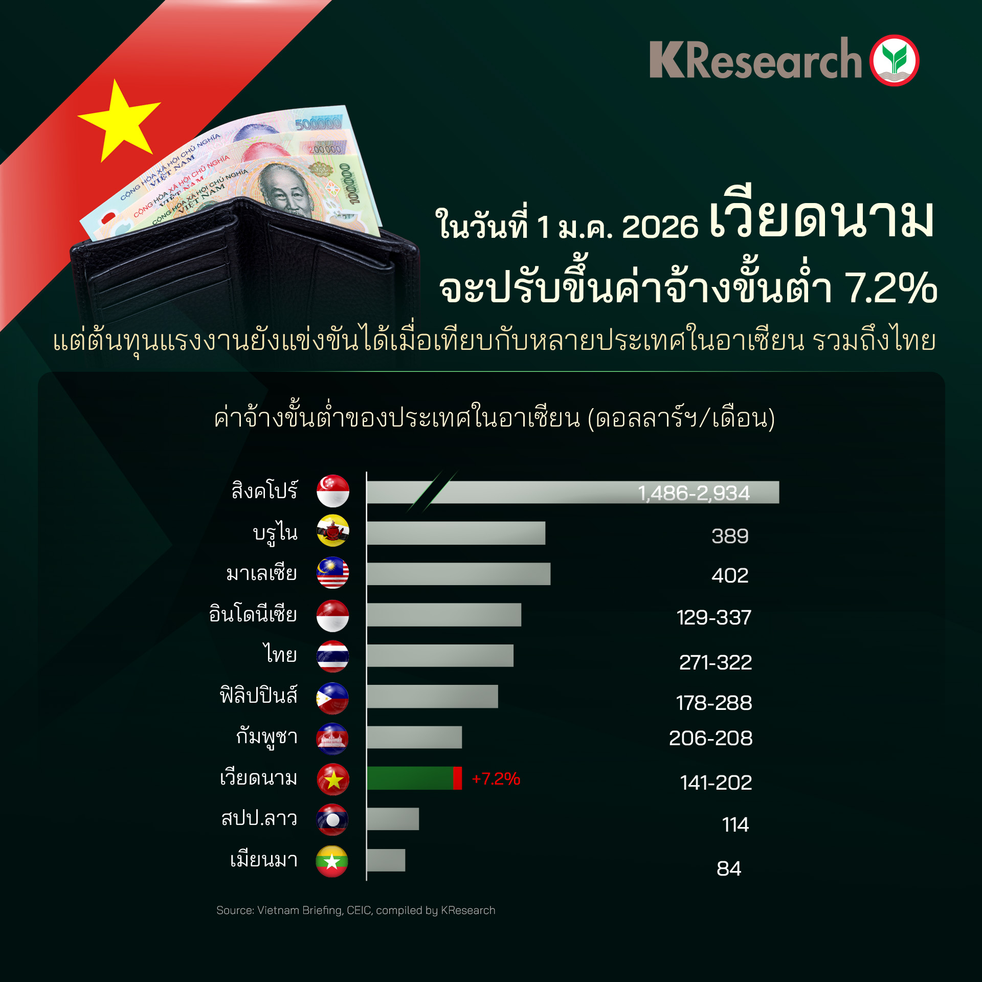 เดือนต.ค. 2025 ส่งออกเวียดนามไปสหรัฐฯ ยังเติบโตดี หนุนโดยการส่งออกสินค้าอิเล็กทรอนิกส์ที่ยังเร่งตัวขึ้นเวียดนามจะปรับขึ้นค่าจ้างขั้นต่ำ 7.2% ในวันที่ 1 ม.ค. 2026 แต่ต้นทุนแรงงานยังแข่งขันได้เมื่อเทียบกับหลายประเทศในอาเซียน รวมถึงไทย