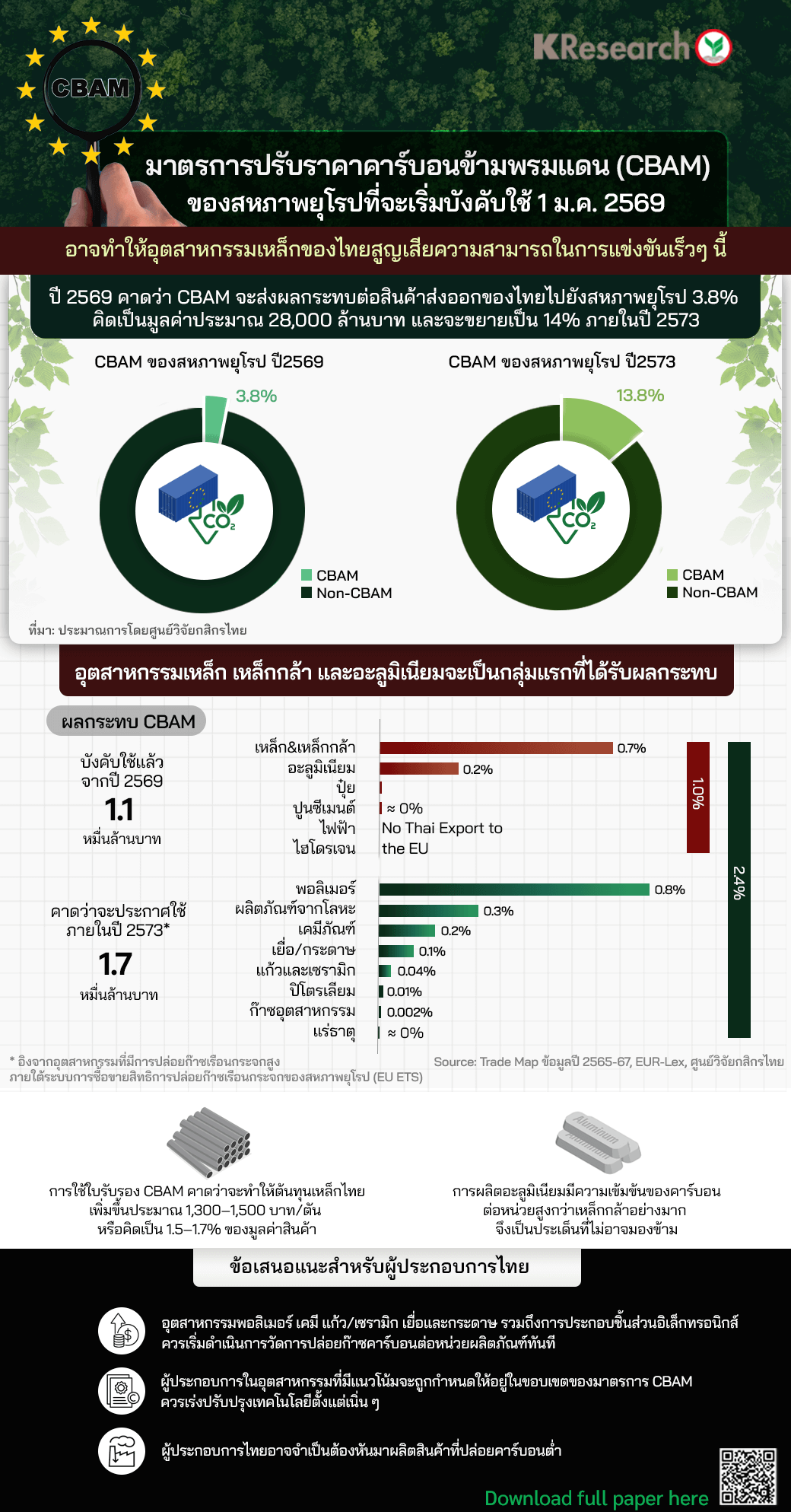 ตั้งแต่วันที่ 1 มกราคม 2569 สหภาพยุโรปจะเริ่มจัดเก็บภาษีนำเข้าภายใต้มาตรการปรับราคาคาร์บอนข้ามพรมแดน (CBAM) ตามปริมาณการปล่อยก๊าซเรือนกระจกของสินค้า ทั้งทางตรงและทางอ้อมจากกระบวนการผลิตของสินค้า โดยในระยะแรก ศูนย์วิจัยกสิกรไทยคาดว่า CBAM จะส่งผลกระทบต่อ 3.8% ของสินค้าส่งออกของไทยไปสหภาพยุโรปในปี 2569 คิดเป็นมูลค่าประมาณ 28,000 ล้านบาท