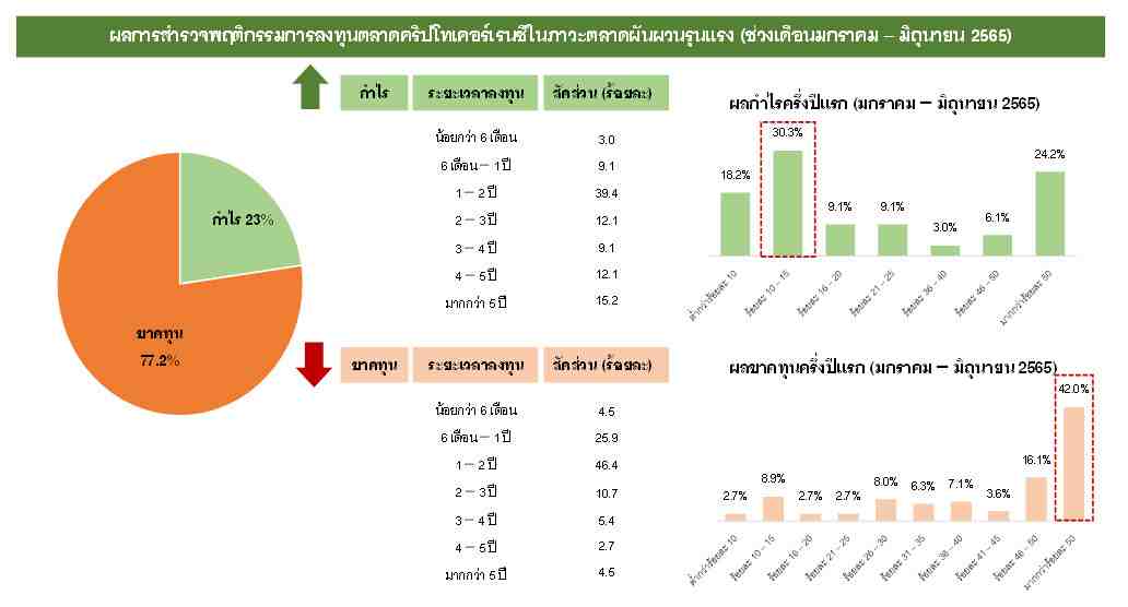 - ในช่วงครึ่งปีแรก (เดือนมกราคม– มิถุนายน 2565) นักลงทุนไทยส่วนใหญ่ราวร้อยละ 77.2 ประสบกับผลขาดทุน และส่วนใหญ่ขาดทุนสูงมากกว่าร้อยละ 50 ขณะเดียวกัน ก็ยังคงมีนักลงทุนบางส่วนที่ได้กำไร โดยส่วนใหญ่จะได้กำไรอยู่ในกรอบร้อยละ 10 – 15