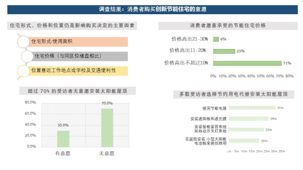 - 由于环境友好型住宅的建筑成本高于普通住宅,大多数受访者表示尚未做好为此支付额外费用的准备,尤其是购房时必须依赖金融机构贷款的中低收入群体,更高的价格将使其分期还款时间更长。调查结果显示,71%的受访者愿意购买价格高于普通住宅不超过10%的环保住宅,23%的受访者愿意购买价格比普通住宅高出11-20%的环保住宅,6%的受访者愿意购买价格比普通住宅高出21-30%的环保住宅。而目前绿色住宅的开发成本平均高于普通住宅30%。