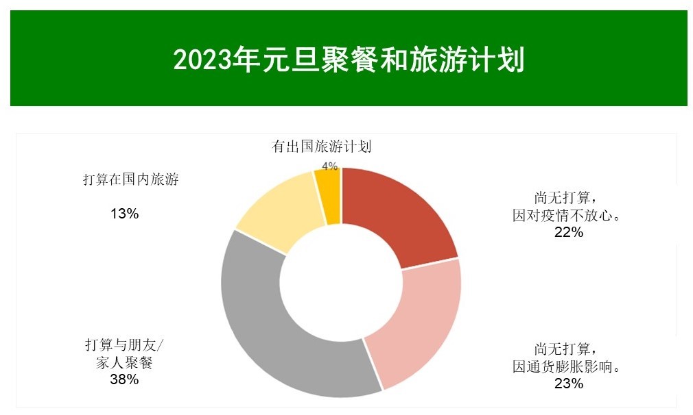由于今年新冠肺炎疫情比去年同期明显缓和,开泰研究中心对居民家庭2023 年元旦期间聚餐和旅游计划进行了补充调查。调查结果显示,38%的受访居民家庭有与朋友/家人聚餐的打算;23%的受访居民家庭因支出居高不下而不打算聚会;另有22% 的受访居民家庭因对疫情不放心也不打算聚会。此外,计划外出旅游的受访居民家庭占55%,其中78%计划在国内旅游,22%计划出国旅游。