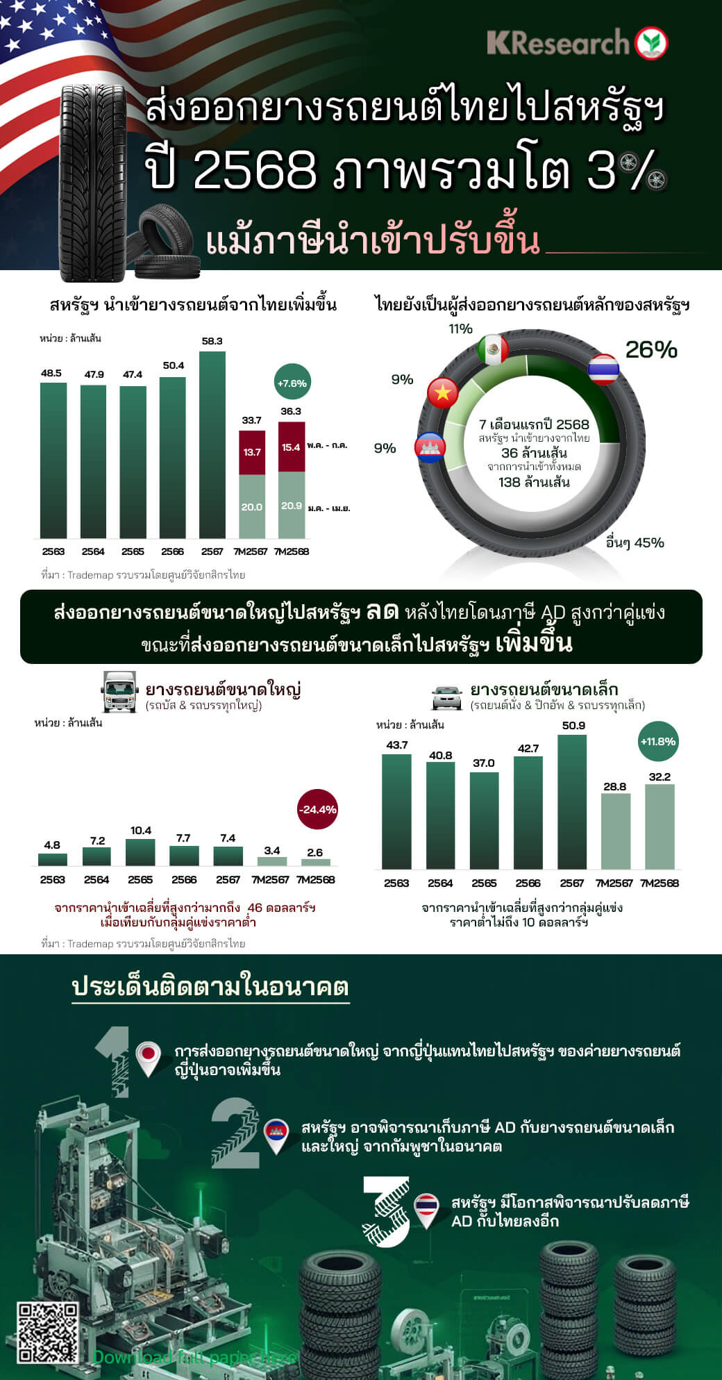 - 原先在泰国生产的日本汽车轮胎品牌转向从日本向美国出口大型汽车轮胎数量趋向增加。原因是自今年8月7日起,日本大型汽车轮胎的进口关税只有15%的对等关税,远低于泰国等竞争对手。因此,如果日本汽车轮胎品牌在泰国生产的产品被征收的高额反倾销税无法降低,未来日本品牌制造商可能继续在日本生产大型汽车轮胎以向美国出口。