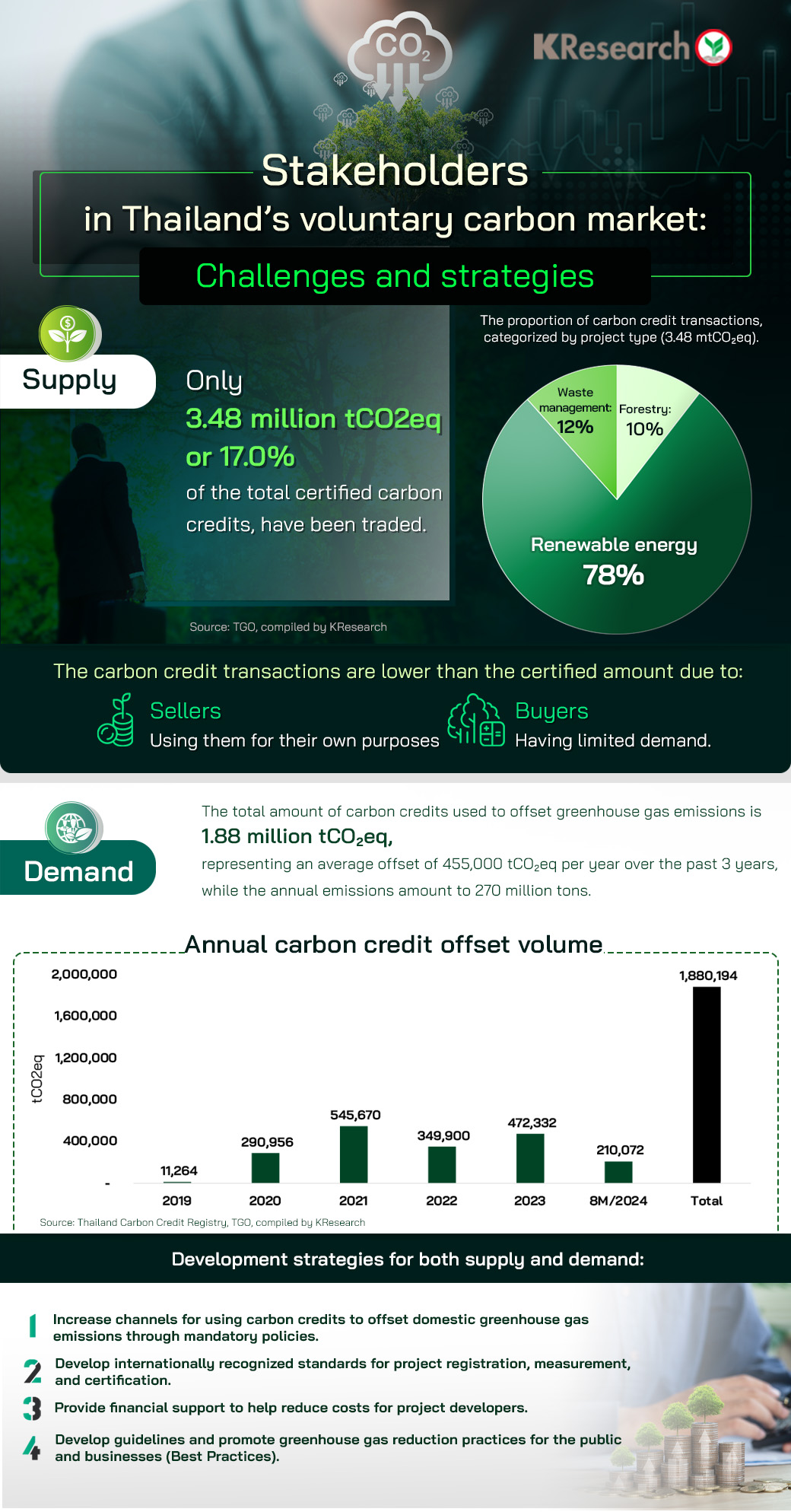 Thailand’s voluntary carbon market remains in its early stages, with significant potential for further development. The current level of greenhouse gas emissions offsetting remains relatively low, accounting for only 0.17% of total emissions. Enhancing the market’s growth requires collaboration among key stakeholders, including government agencies, private sector entities, academic institutions, and international organizations, to promote broader participation and market adoption. To support both supply- and demand-side stakeholders, KResearch has proposed the following development strategies: