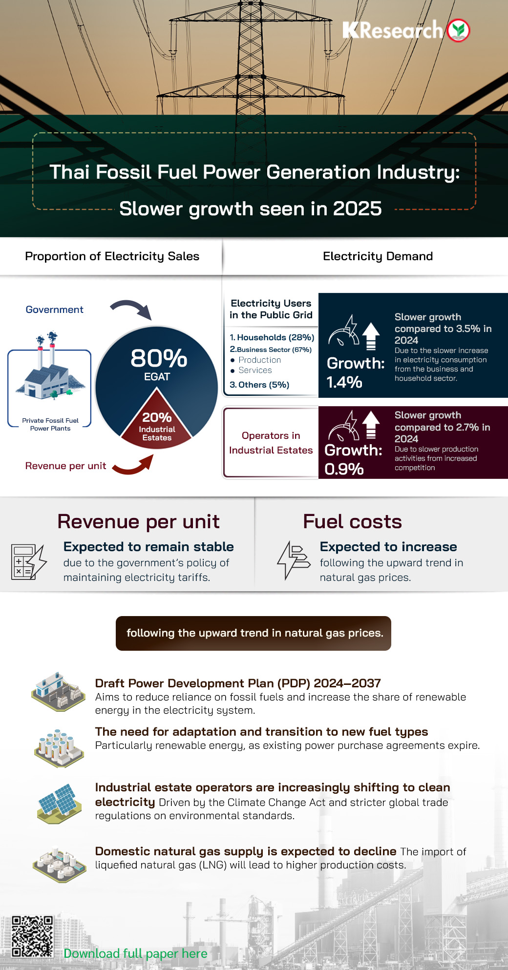 - Meanwhile, revenue from fossil fuel-based electricity generation for industrial estate users is also expected to continue expanding in 2025. However, the growth rate is likely to slow, when compared to the previous year due to a more moderate increase in electricity demand from industrial estates, reflecting a slowdown in manufacturing activity amid pressures from the oversupply of Chinese goods in the market.