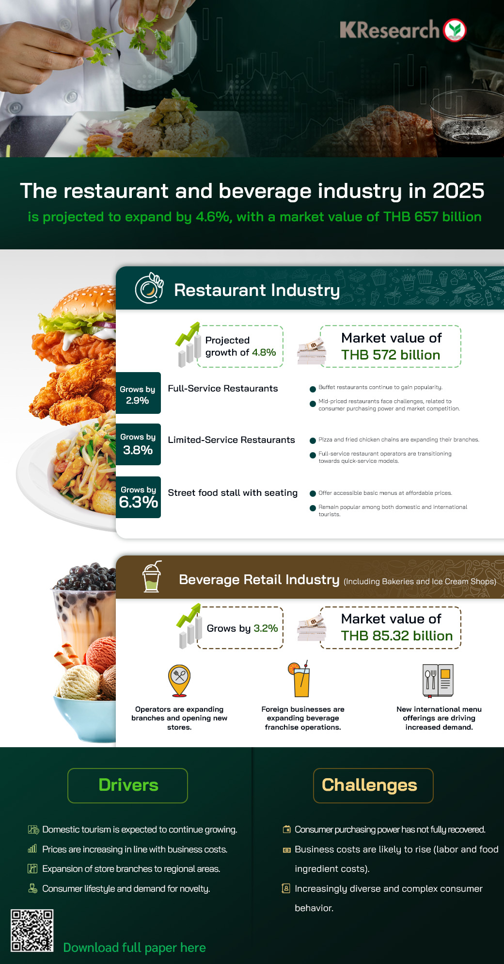 - The restaurant and beverage industry in 2025 is projected to see a total turnover of THB 657 billion, growing by 4.6% from 20 YoY. This growth is driven by the continued expansion of domestic tourism, regional branch openings by operators, and increased consumer demand for new food and beverage options. However, the industry faces high competition, requiring careful investment consideration.