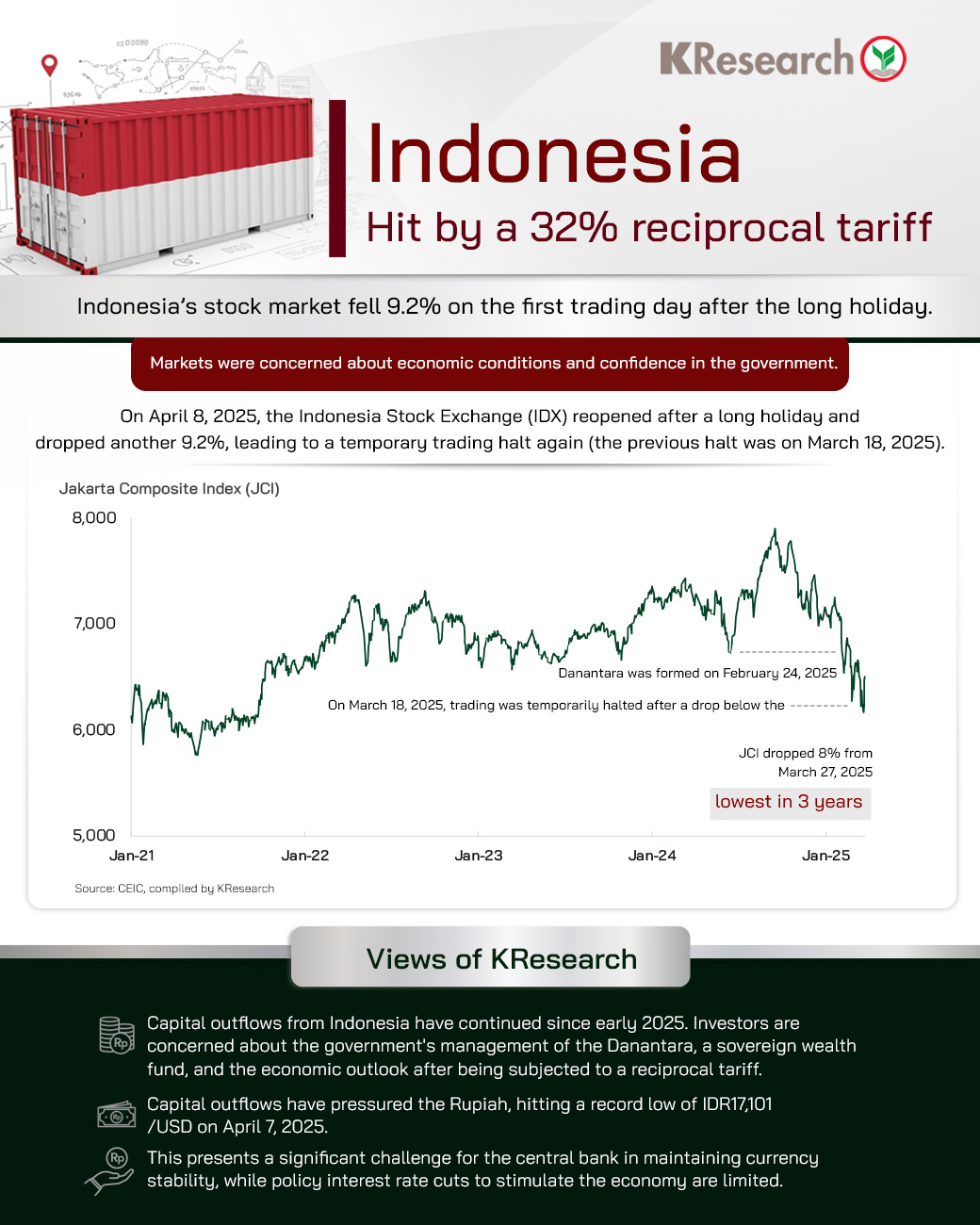 Indonesia hit by a 32% reciprocal tariff; its stock market fell 9.2% on the first trading day after the long holiday