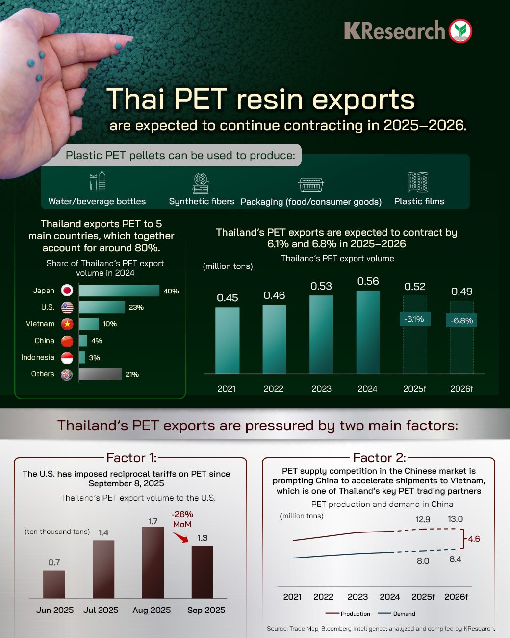 Thailand’s PET resin exports are expected to contract by 6.1% and 6.8% in 2025–2026 due to: