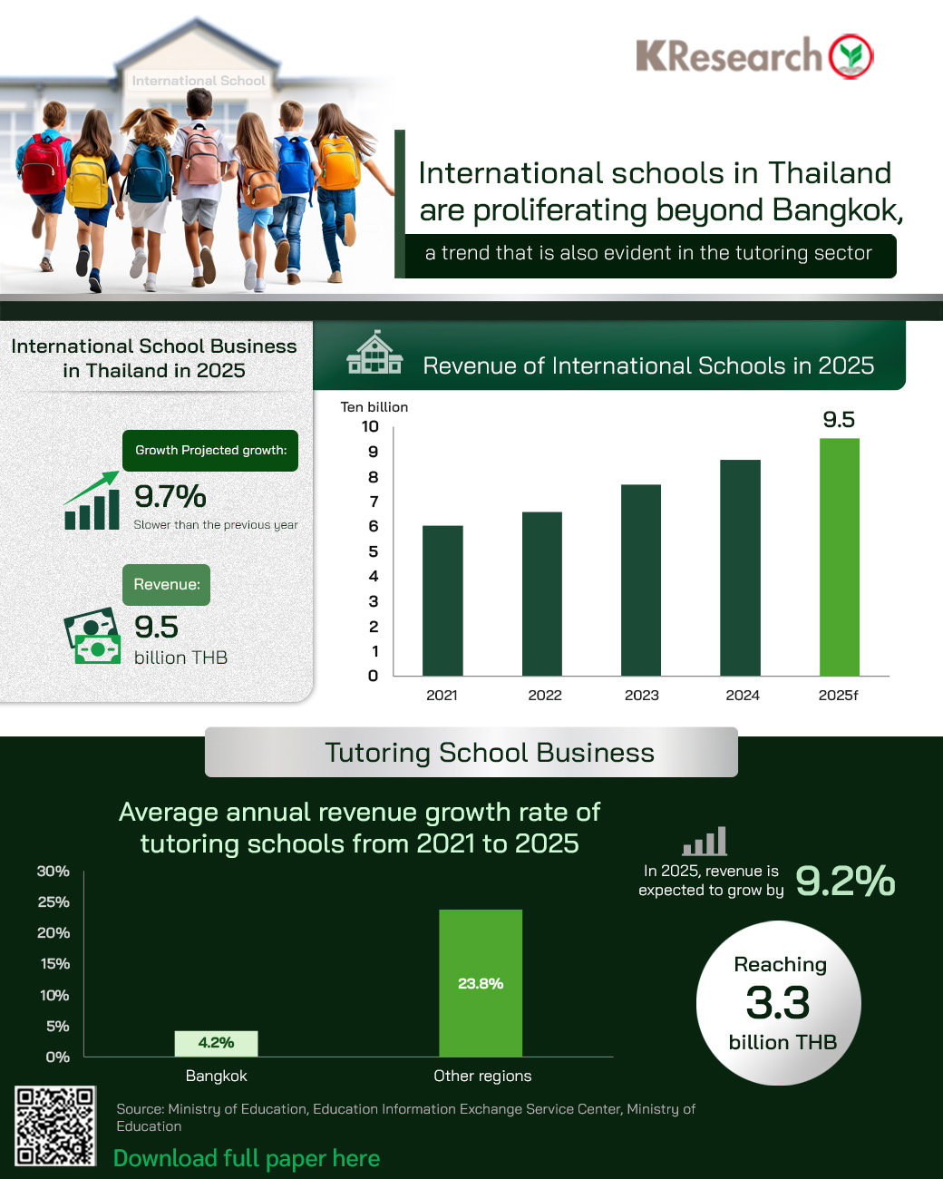 - The tutoring school sector is following a similar trend as international schools. In 2025, revenue from tutoring businesses is forecasted to increase by 9.2%. Between 2021 and 2025, regions outside Bangkok are expected to experience a revenue growth rate 19.7% higher than that in Bangkok.