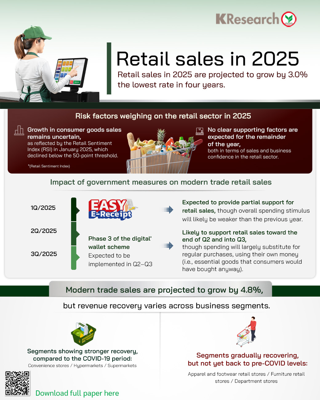 KResearch maintains its forecast that Thailand’s retail sales in 2025 will grow by 3.0%, a slowdown from the previous year and the lowest rate in four years, with total sales estimated at THB4.25 trillion (Figure 1), amid several downside risks.