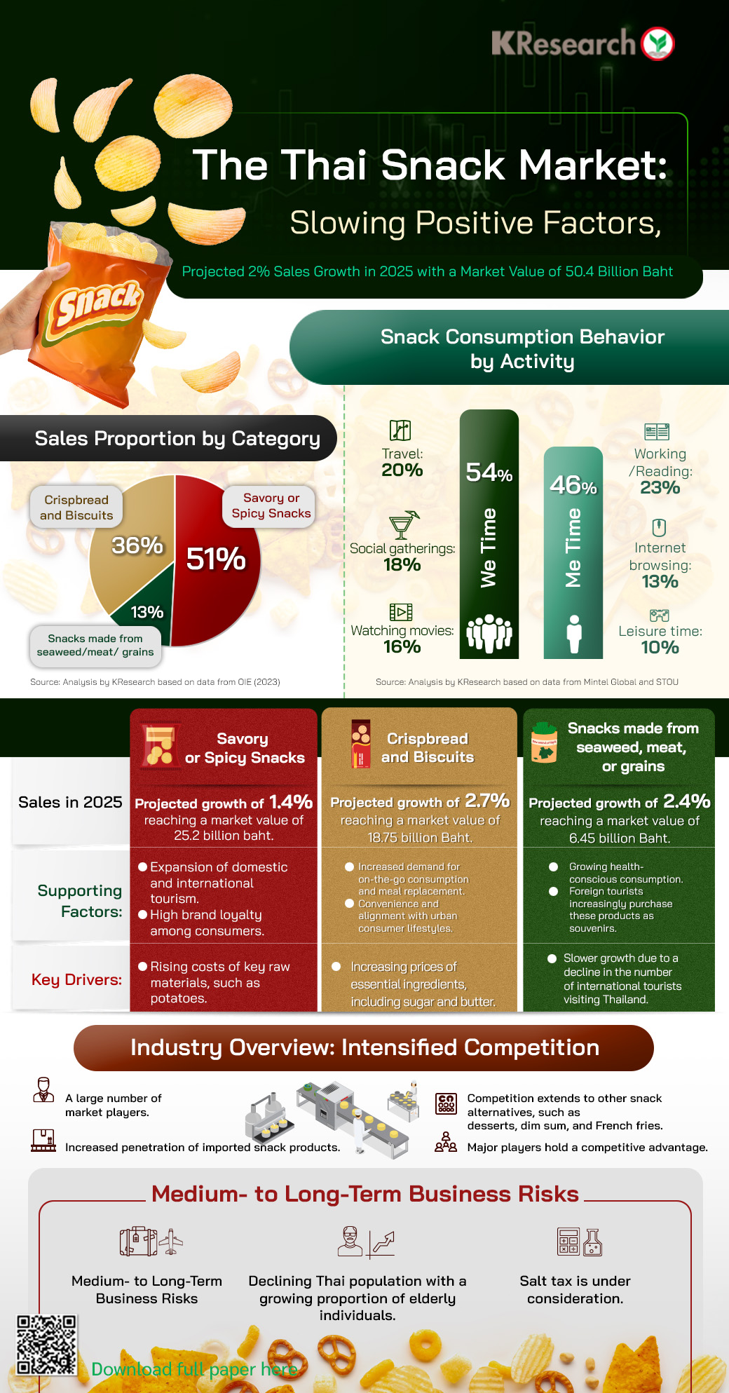 In 2025, sales of Thai snack products are expected to grow by 2%, marking a slowdown from the 6% growth recorded in 2024 (Figure 2). This deceleration is primarily due to weaker positive factors, compared to 2024, particularly the slower expansion of Thailand’s tourism sector. As a result, the consumption of snack products during travel and social gatherings is projected to see only modest growth. Additionally, key production costs, particularly for certain essential raw materials, are expected to increase. The Thai snack market can be categorized into three segments, based on sales share. The largest segment comprises savory and spicy snacks, accounting for approximately 51% of total sales, followed by crackers and biscuits at 36%, and seaweed-, meat-, and grain-based snacks at 13% (Figure 3).Consumers primarily consume snack products during social or travel-related activities, termed “We Time,” which accounts for 54% of total snack consumption. The remaining 46% occurs during individual leisure time, known as “Me Time” (Figure 4). The domestic snack market is highly competitive, driven by a large number of market participants and an increasing influx of imported products. Currently, there are over 590 registered corporate entities operating in Thailand’s snack industry, according to data from the Department of Business Development. Additionally, the snack market maintains a relatively high gross profit margin of approximately 20–35%, partly due to the relatively low cost of agricultural raw materials, which enables strong value creation. This profitability has attracted a substantial number of new entrants, intensifying market competition and resulting in a highly competitive “Red Ocean” environment. The intense competition is primarily driven by major industry players who benefit from economies of scale and maintain a continuous product rotation. These leading firms actively invest in innovation and creativity by introducing new flavors and product lines to sustain the market dynamic. Although existing products remain popular, maintaining brand vibrancy and market engagement is a crucial driver of business growth. Leading players effectively manage costs and marketing expenditures, enabling them to implement regular promotional campaigns to stimulate sales, enhance brand awareness, and encourage consumption. In contrast, smaller players face greater challenges in competing within the market. Although major players dominate the market, competition at the product level remains intense. Companies must not only compete among the diverse range of snack products but also contend with cross-category competition from other snack alternatives, such as confectionery, dim sum, French fries, and meatballs. Consequently, overall market expansion is constrained by the difficulty of increasing consumption frequency. To address this challenge, some firms employ marketing strategies designed to attract and engage key target demographics, particularly teenagers. These strategies often include collectible promotional items, such as hugely popular game cards, along with collectible coins, stickers, and plush toys, to stimulate sales and reinforce brand engagement. The growing influx of diverse imported snacks, including popular Chinese and Korean fast food items such as fried chicken, is further intensifying competition in the Thai snack market. Although the volume of imported snacks remains relatively small, from 2020 to 2023, imports of crackers and wafers have grown at an average rate exceeding 8% from 2020 to 2023, with a significant 11% increase in the first 10 months of 2024. Conversely, Thai snack exports, which account for approximately 18% of total volume, are facing mounting challenges. From 2021 to 2023, export volumes contracted by an average of 0.5% per year. While the first 10 months of 2024 showed a positive 7% uptick, the outlook remains uncertain due to intense competition, particularly in the Chinese market. There, both established and new snack brands, combined with lower pricing, are likely to exert continued pressure on Thai snack exports.