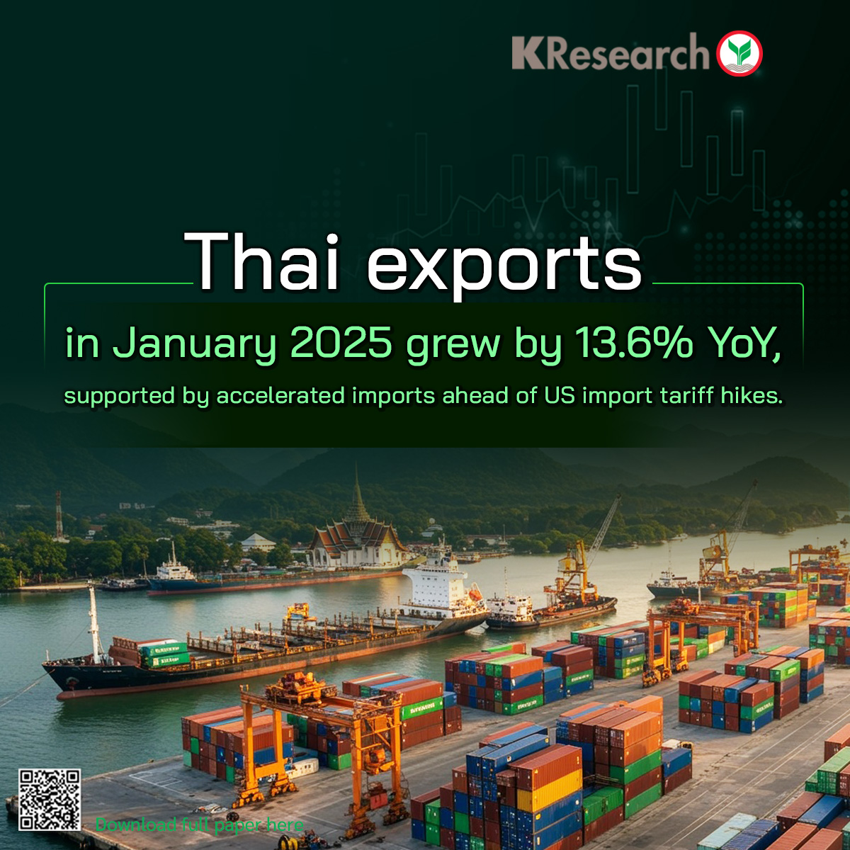 • However, due to the uncertainty surrounding the US import tariff increases, KResearch has initially estimated that the impact of US tariff hikes may shave Thai exports by -0.5%. This impact has already been incorporated into the overall Thai export forecast for 2025 at 2.5%, a decline from that reported in the previous year. The impact stems from: