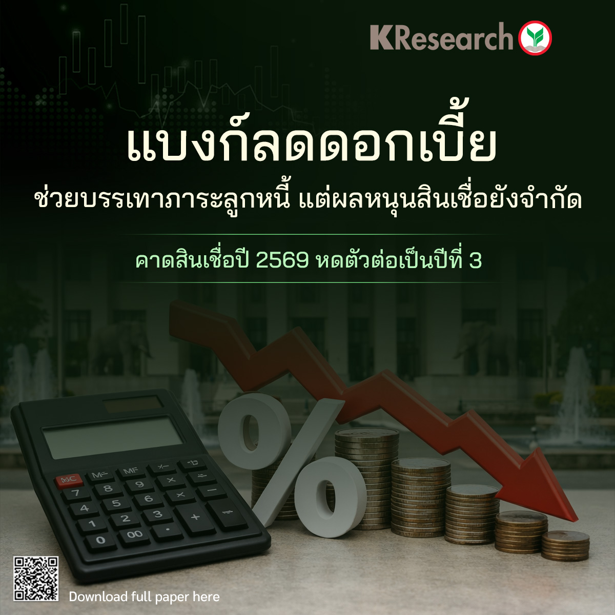 โดยสรุป ศูนย์วิจัยกสิกรไทย มองว่า แม้การปรับลดอัตราดอกเบี้ยจะช่วยลดต้นทุนทางการเงินและหนุนความสามารถในการชำระคืนหนี้ของลูกหนี้ อย่างไรก็ดี คงต้องยอมรับว่าสินเชื่อในปี 2569 จะยังคงมีโอกาสหดตัวลง -0.7% (นับเป็นการหดตัวของสินเชื่อติดต่อกันเป็นปีที่ 3) เพราะการเบิกใช้สินเชื่อไม่ได้ขึ้นอยู่กับปัจจัยด้านต้นทุนดอกเบี้ยเพียงปัจจัยเดียว แต่สถานการณ์เศรษฐกิจ รายได้ ความเสี่ยงด้านเครดิต ตลอดจนความสามารถในการชำระหนี้ของลูกหนี้ ก็ล้วนเป็นองค์ประกอบสำคัญที่จะมีผลต่อแนวโน้มของสินเชื่อด้วยเช่นกัน