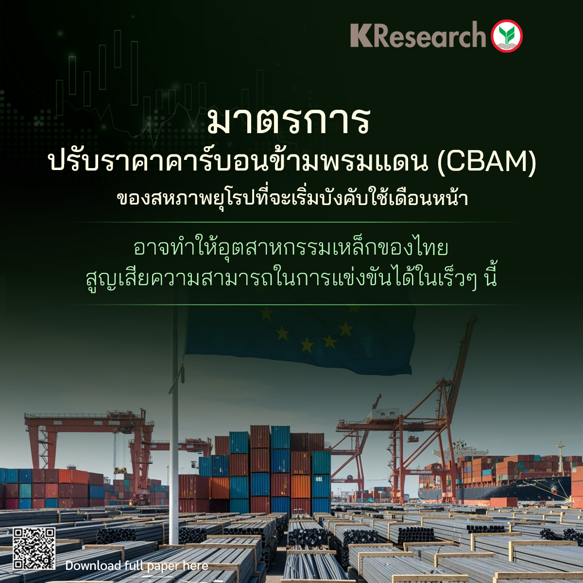 ตั้งแต่วันที่ 1 มกราคม 2569 สหภาพยุโรปจะเริ่มจัดเก็บภาษีนำเข้าภายใต้มาตรการปรับราคาคาร์บอนข้ามพรมแดน (CBAM) ตามปริมาณการปล่อยก๊าซเรือนกระจกของสินค้า ทั้งทางตรงและทางอ้อมจากกระบวนการผลิตของสินค้า โดยในระยะแรก ศูนย์วิจัยกสิกรไทยคาดว่า CBAM จะส่งผลกระทบต่อ 3.8% ของสินค้าส่งออกของไทยไปสหภาพยุโรปในปี 2569 คิดเป็นมูลค่าประมาณ 28,000 ล้านบาท