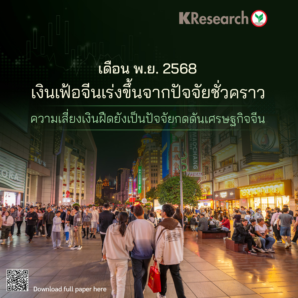 o ศูนย์วิจัยกสิกรไทย มองว่า เงินเฟ้อจีนเร่งตัวขึ้นจากปัจจัยชั่วคราว ขณะที่มาตรการ Anti-involution ของจีนยังต้องใช้เวลากว่าจะแก้ไขปัญหาเรื่องสงครามราคาได้ โดยกำไรภาคอุตสาหกรรมของจีนในเดือนต.ค.68 หดตัวอยู่ที่ 5.5%YoY (รูปที่ 5) ปัญหาเงินฝืดจะยังเป็นปัจจัยกดดันการใช้จ่าย และเศรษฐกิจจีนต่อเนื่องไปจนถึงปี 2026 โดยมี 3 ปัจจัยสำคัญที่ต้องจับตามอง คือ