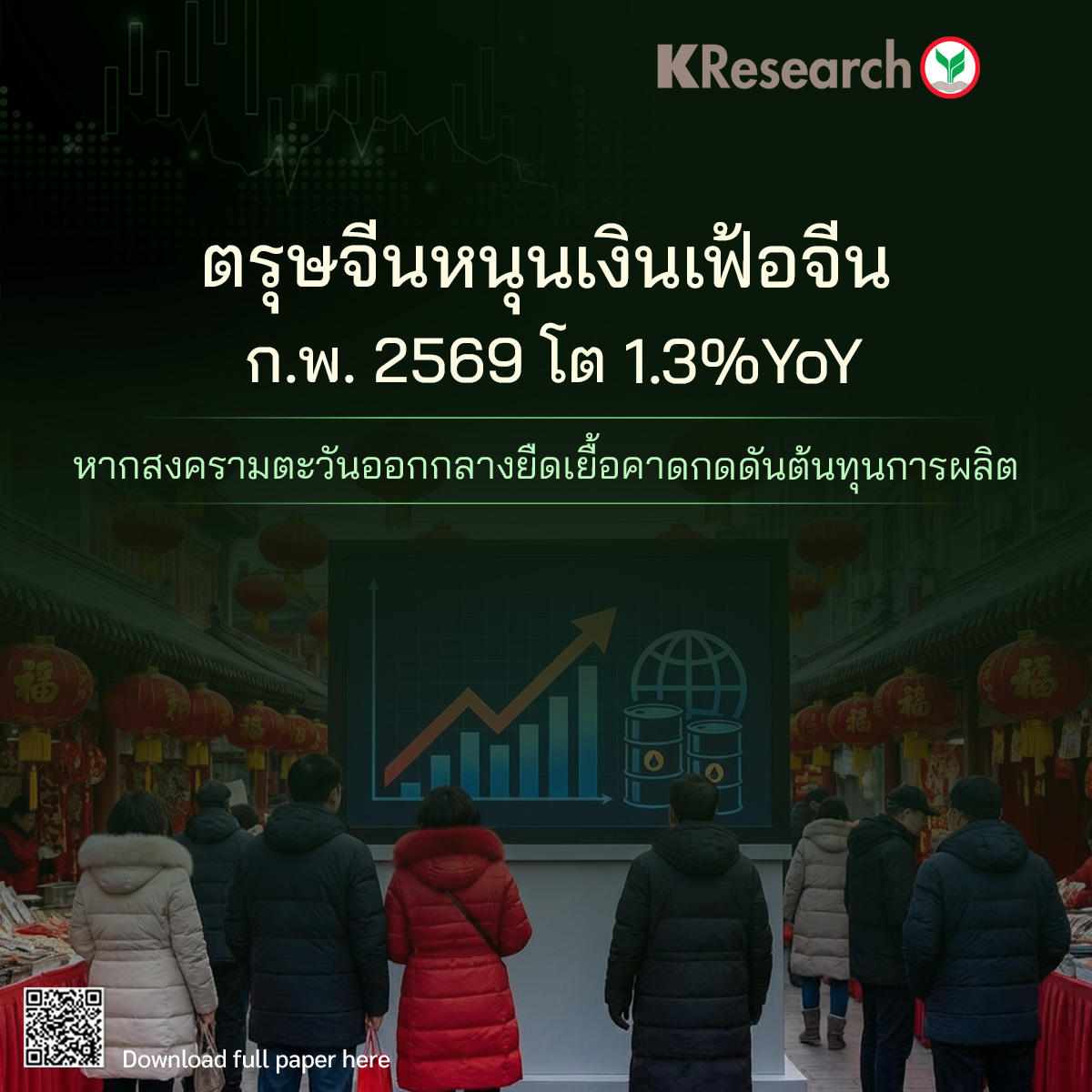 o ศูนย์วิจัยกสิกรไทยมองว่าเงินเฟ้อจีนเร่งตัวขึ้นจากปัจจัยชั่วคราวอย่างเทศกาลตรุษจีน แต่ปัจจัยกดดันต่อการใช้จ่ายในประเทศยังมีอยู่ โดยเมื่อพิจารณาการท่องเที่ยวช่วงเทศกาลตรุษจีน แม้จำนวนนักท่องเที่ยว และรายได้จะเพิ่มขึ้น แต่การใช้จ่ายเพื่อการท่องเที่ยวต่อหัว (Tourist Expenditure per capita) ลดลงเล็กน้อยอยู่ที่ 1,348 หยวน จาก 1,351 หยวน สะท้อนว่าครัวเรือนยังมีแนวโน้มระมัดระวังการใช้จ่าย ขณะที่ในการประชุมสองสภาของจีนปี 2569 ได้ประกาศเป้าหมายการเติบโตของเศรษฐกิจจีนปี 2569 ชะลอลงอยู่ที่ 4.5-5.0% และเป้าหมายเงินเฟ้อคงเดิมอยู่ที่ 2.0% โดยงบประมาณขาดดุล (Board deficit) อยู่ที่ 4% คงเดิมจากปีก่อน รวมถึงวงเงินการออกพันธบัตรรัฐบาลท้องถิ่นไม่เปลี่ยนแปลง สะท้อนว่า ปี 2569 นี้จีนจะเน้นการเติบโตอย่างมีคุณภาพ โดยคาดว่าจะไม่มีมาตรการกระตุ้นการใช้จ่ายขนาดใหญ่ แต่เน้นเป็นมาตรการเฉพาะจุดเพื่อแก้ไขปัญหาเชิงโครงสร้าง เช่น การเพิ่มสวัสดิการผู้สูงอายุ หรือมาตรการที่สนับสนุนอัตราการเกิด เป็นต้น ซึ่งคาดว่าผลจากมาตรการจะส่งผ่านมาสู่เงินเฟ้อได้จำกัด และต้องใช้ระยะเวลากว่าจะเห็นผล