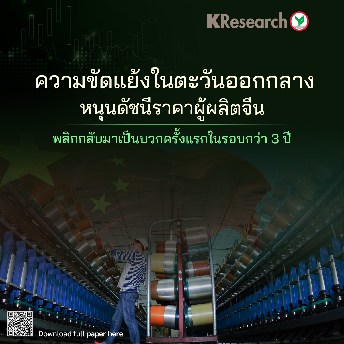 o เดือนมี.ค.2026 ดัชนีราคาผู้ผลิตจีนขยายตัวเพิ่มขึ้นอยู่ที่ 0.5%YoY หลังติดลบมายาวนานติดต่อกันกว่า 41 เดือน ได้รับปัจจัยหนุนจากราคาสินค้าโภคภัณฑ์ เช่น ราคาน้ำมัน ที่ปรับเพิ่มขึ้นจากความขัดแย้งในตะวันออกกลาง รวมถึงการใช้มาตรการ Anti-involution ของจีนที่เริ่มส่งผลบวกในบางอุตสาหกรรมโดยเฉพาะในอุตสาหกรรม Non Ferrous Metal and Electric Wire ที่ดัชนีราคาผู้ผลิตในกลุ่มอุตสาหกรรมนี้ปรับเพิ่มขึ้น 22.3%YoY