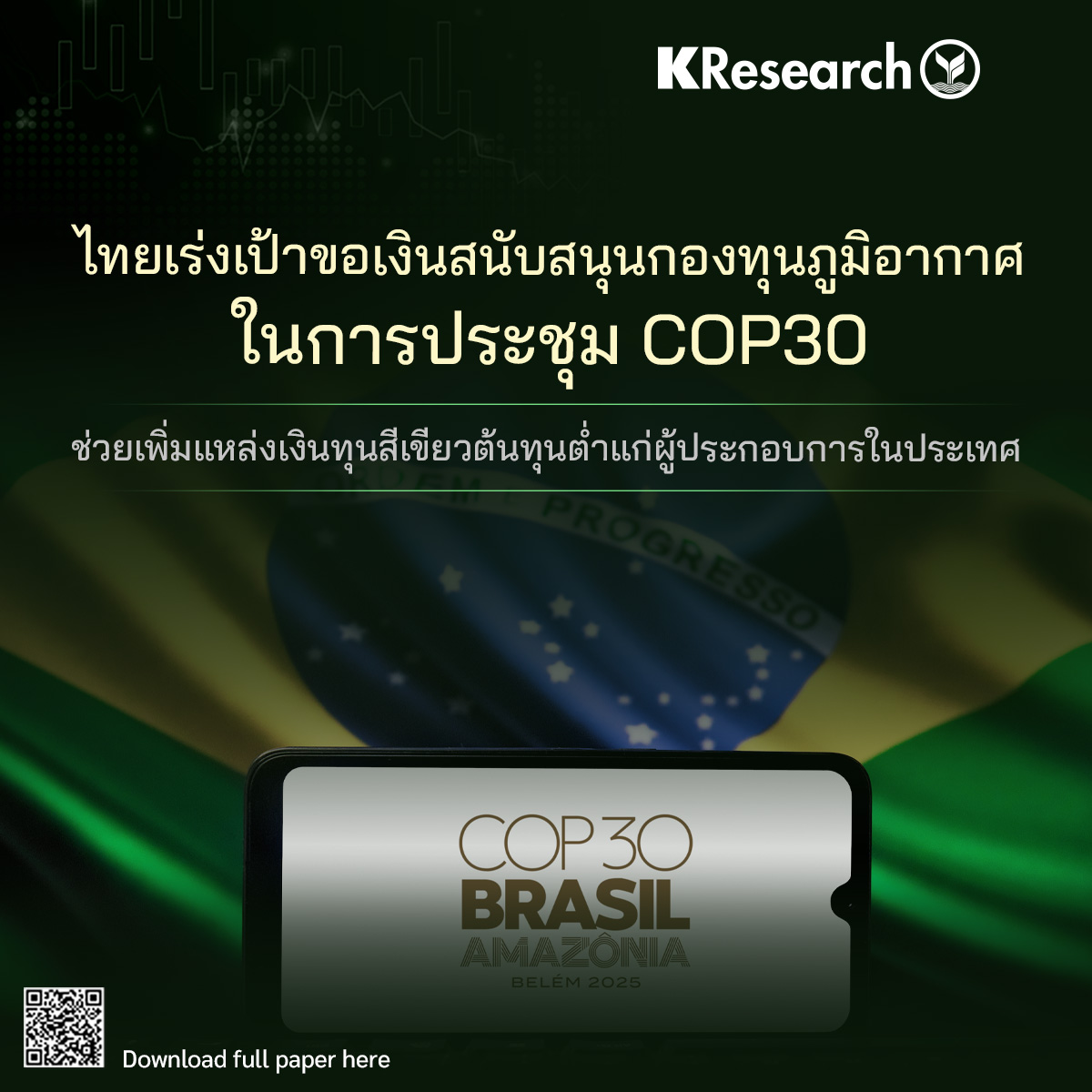 ไทยเร่งเป้าขอเงินสนับสนุนกองทุนภูมิอากาศในการประชุม COP30 ช่วยเพิ่มแหล่งเงินทุนสีเขียวต้นทุนต่ำแก่ผู้ประกอบการในประเทศ
