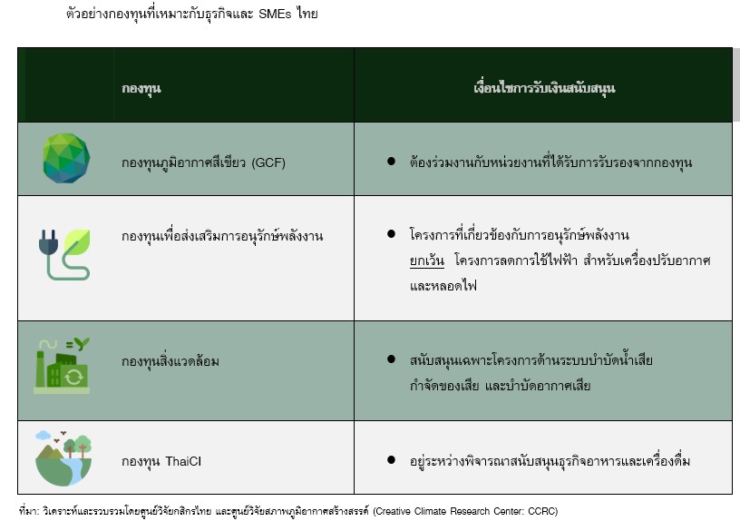 หากปัจจุบันผู้ประกอบการ SMEs พร้อมลงทุนในโครงการด้านความยั่งยืน แต่เผชิญข้อจำกัดในการเข้าถึงสินเชื่อ สามารถขอรับเงินสนับสนุนต้นทุนต่ำจากกองทุนด้านการเปลี่ยนแปลงสภาพภูมิอากาศ จากทั้งในไทยและต่างประเทศ ตามความเหมาะสมของธุรกิจและวัตถุประสงค์โครงการ        (ศึกษาเพิ่มเติมที่: ส่องแหล่งขอทุนสำคัญด้าน Climate Change ที่องค์กรไทยควรรู้)