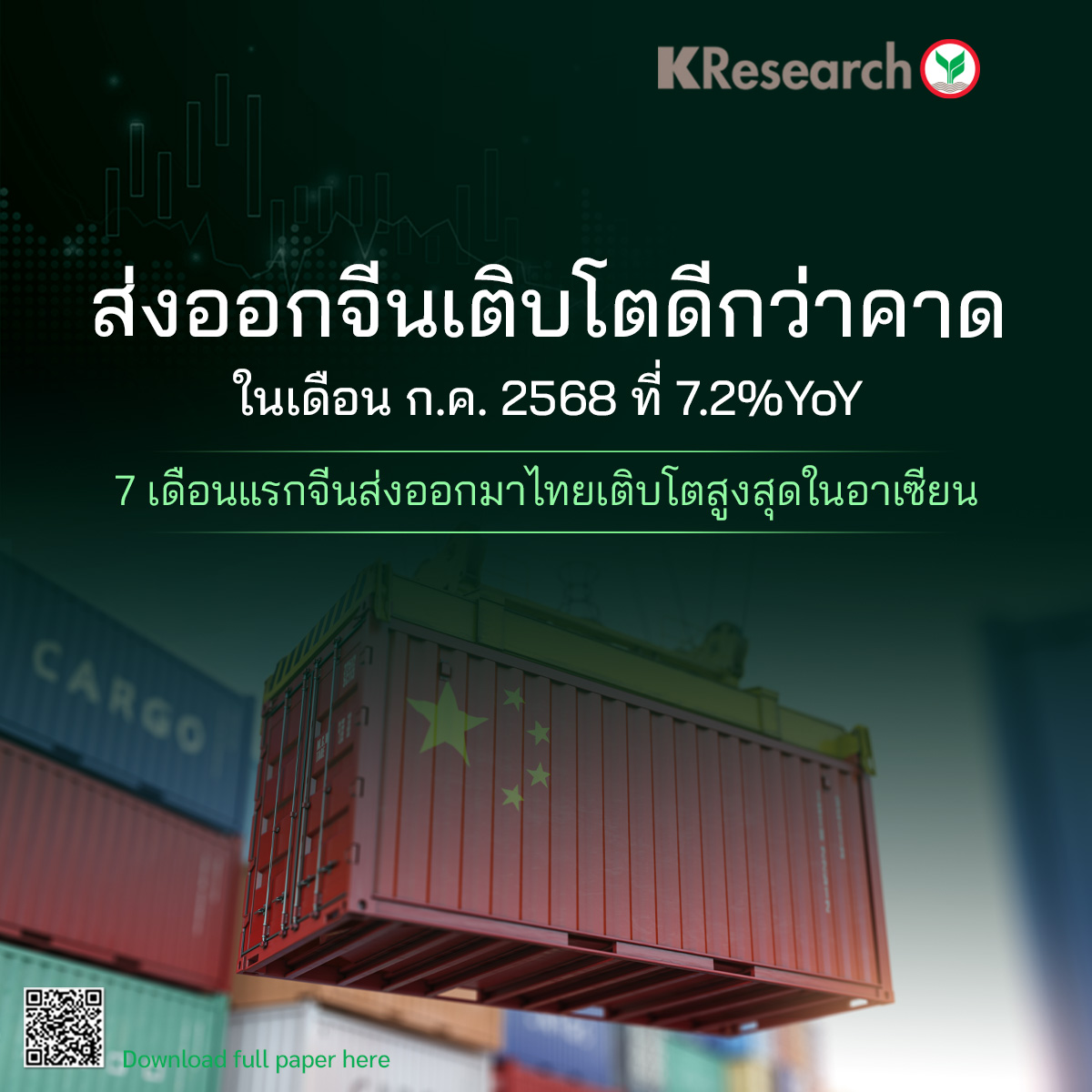 o ตั้งแต่เดือนก.พ.68 หลังนายทรัมป์เข้ารับตำแหน่งประธานาธิบดีสหรัฐฯ แม้จีนจะยังเกินดุลการค้ากับสหรัฐฯ แต่ระดับการเกินดุลของจีนเกินดุลกับสหรัฐฯ ลดลงกว่าค่าเฉลี่ยของทั้งปี 67 (รูปที่ 3) สะท้อนว่าการเข้ามาดำรงตำแหน่งของนายทรัมป์ส่งผลให้การค้าระหว่างสหรัฐฯ และจีนมีทิศทางชะลอลง o นอกจากนี้ ใน 7 เดือนแรกของปี การเติบโตของการส่งออกจากจีนไปสหรัฐฯ ปรับตัวลดลงถึง -12.6%YoY ขณะที่การส่งออกไปอาเซียนเติบโตเร่งขึ้นอยู่ที่ 13.5%YoY โดยการส่งออกจากจีนมาไทยเติบโตสูงสุดในอาเซียนอยู่ที่ 22.6%YoY รองลงมาคือเวียดนามอยู่ที่ 20.7% (รูปที่ 4) สะท้อนว่าปัญหาสินค้าราคาถูกจากจีนที่ทะลักเข้าไทยยังคงมีอยู่ โดยเฉพาะสินค้าในหมวดเครื่องแต่งกาย ของใช้ส่วนตัว และของตกแต่งบ้าน o ศูนย์วิจัยกสิกรไทยมองว่าในช่วงที่เหลือของปี 2568 การส่งออกจีนมีแนวโน้มเติบโตชะลอลง โดยเผชิญความเสี่ยงอีกหลายประการ ดังนี้ 1. อัตราภาษีใหม่ที่สหรัฐฯ เรียกเก็บจากประเทศในอาเซียนจะกลับมาอยู่ในระดับสูงที่ 10-40% นอกจากนี้ สหรัฐฯ ยังมีเงื่อนไขเพิ่มเติมในการเก็บภาษีสินค้าสวมสิทธิ์ (Transshipment) ที่ 40% ซึ่งจะส่งผลให้การส่งออกสินค้าผ่านประเทศที่สามของจีนมีต้นทุนที่สูงขึ้น