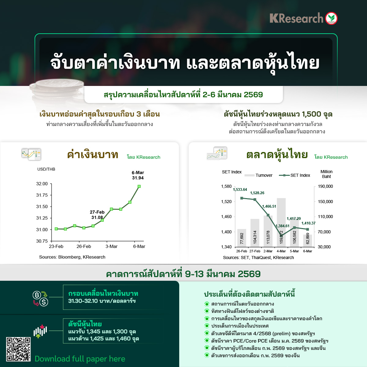• สัปดาห์ที่ 9-13 มี.ค. 2569 KSecurities คาดแนวรับที่ 1,345 และ 1,300 จุด ขณะที่ แนวต้านอยู่ที่ 1,425 และ 1,460 จุด ตามลำดับ โดยปัจจัยที่ต้องติดตาม ได้แก่ สถานการณ์ตึงเครียดในตะวันออกกลาง ประเด็นการเมืองในประเทศ และทิศทางเงินทุนต่างชาติ ดัชนีราคาผู้บริโภคเดือนก.พ. ดัชนีราคา PCE/Core PCE เดือนม.ค. และตัวเลขจีดีพีไตรมาส 4/2568 ของสหรัฐฯ ดัชนีราคาผู้บริโภคและดัชนีราคาผู้ผลิตเดือนก.พ. ของจีน ตัวเลขจีดีพีไตรมาส 4/2568 และดัชนีราคาผู้ผลิตเดือนก.พ. ของญี่ปุ่น รวมถึงผลผลิตภาคอุตสาหกรรมเดือนม.ค. ของยูโรโซน