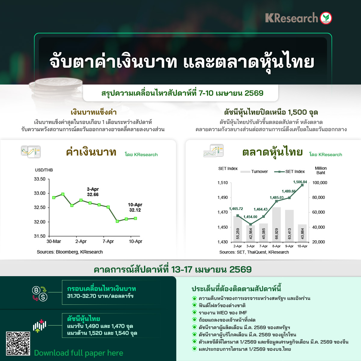• สัปดาห์ระหว่างวันที่ 16-17 เม.ย. 2569 KBank คาดกรอบการเคลื่อนไหวของเงินบาทที่ 31.70-32.70 บาทต่อดอลลาร์ฯ ปัจจัยที่ต้องติดตาม ได้แก่ สถานการณ์ในตะวันออกกลาง โดยเฉพาะความคืบหน้าของการเจรจาระหว่างสหรัฐฯ และอิหร่าน ทิศทางราคาน้ำมันในตลาดโลก ฟันด์โฟลว์ของต่างชาติ รายงาน World Economic Outlook ของ IMF ถ้อยแถลงของเจ้าหน้าที่เฟด ตัวเลขยอดขายบ้านมือสอง ดัชนีราคาผู้ผลิต ดัชนีราคานำเข้า/ส่งออกและการผลิตภาคอุตสาหกรรมเดือนมี.ค. ของสหรัฐฯ รวมถึงตัวเลขจีดีพีไตรมาส 1/2569 และข้อมูลเศรษฐกิจเดือนมี.ค. ของจีน