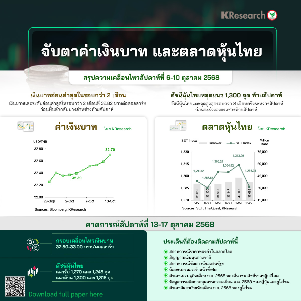 - เงินบาทแตะระดับอ่อนค่าสุดในรอบกว่า 2 เดือนที่ 32.82 บาทต่อดอลลาร์ฯ ก่อนฟื้นตัวกลับบางส่วนช่วงท้ายสัปดาห์ ทั้งนี้เงินบาททยอยอ่อนค่าผ่านระดับสำคัญทางจิตวิทยาหลายแนวในสัปดาห์นี้ โดยเงินบาทอ่อนค่าลงในช่วงต้นสัปดาห์สอดคล้องกับสถานะขายสุทธิหุ้นและพันธบัตรไทยของนักลงทุนต่างชาติ และการคาดการณ์ของตลาดต่อโอกาสการปรับลดดอกเบี้ยของกนง. ในการประชุมช่วงกลางสัปดาห์ (8 ต.ค.) หลังตัวเลขเงินเฟ้อของไทยเดือนก.ย. ออกมาต่ำกว่าที่คาด อย่างไรก็ดี เงินบาทปรับแข็งค่าไปที่แนว 32.40 ช่วงสั้นๆ หลังกนง. มีมติคงอัตราดอกเบี้ยนโยบายไว้ที่ระดับเดิม 1.50% ก่อนจะอ่อนค่าลงอีกครั้งในช่วงที่เหลือของสัปดาห์ เนื่องจากตลาดประเมินว่า แม้กนง. จะคงดอกเบี้ย แต่เศรษฐกิจที่มีแนวโน้มชะลอลง ทำให้ยังคงมีความเป็นไปได้ที่จะปรับลดดอกเบี้ยลงเพิ่มเติมอีกในระยะข้างหน้า เงินบาทแตะระดับอ่อนค่าสุดในรอบกว่า 2 เดือน (นับตั้งแต่ 4 ส.ค.) ที่ 32.82 สอดคล้องกับแรงขายทำกำไรทองคำในตลาดโลก ขณะที่เงินดอลลาร์ฯ ยังมีแรงหนุนจากทิศทางที่อ่อนค่าของเงินเยนจากการคาดการณ์ว่า ธนาคารกลางญี่ปุ่นอาจจะไม่ปรับขึ้นอัตราดอกเบี้ยในการประชุมเดือนนี้ และแรงกดดันของเงินยูโรจากความไม่แน่นอนทางการเมืองของฝรั่งเศส อย่างไรก็ดี เงินบาทฟื้นตัวกลับมาได้บางส่วนในช่วงท้ายสัปดาห์ก่อนเข้าสู่ช่วงหยุดยาวของตลาดการเงินในประเทศ