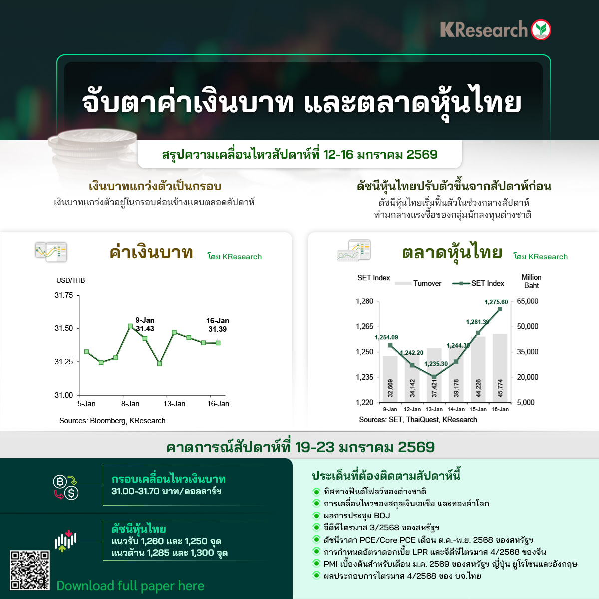 • สัปดาห์ที่ 19-23 ม.ค. 2569 KSecurities คาดแนวรับที่ 1,260 และ 1,250 จุด ขณะที่ แนวต้านอยู่ที่ 1,285 และ 1,300 จุด ตามลำดับ โดยปัจจัยที่ต้องติดตาม ได้แก่ ผลประกอบการไตรมาส 4/2568 ของบจ.ไทย ทิศทางเงินทุนต่างชาติ รายได้และรายจ่ายส่วนบุคคลเดือนต.ค. - พ.ย. และตัวเลขจีดีพีไตรมาส 3/2568 ของสหรัฐฯ การประชุม BOJ ดัชนี PMI เดือนม.ค. (เบื้องต้น) ของสหรัฐฯ ญี่ปุ่น ยูโรโซนและอังกฤษ ตลอดจนตัวเลขจีดีพีไตรมาส 4/2568 ของจีน