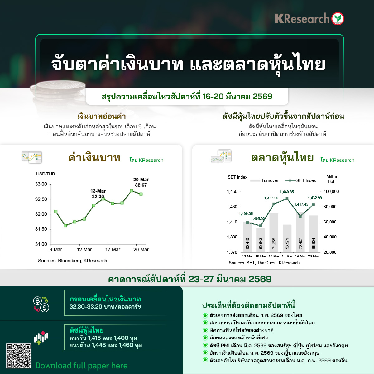 • สัปดาห์ระหว่างวันที่ 23-27 มี.ค. 2569 KBank คาดกรอบการเคลื่อนไหวของเงินบาทที่ 32.30-33.20 บาทต่อดอลลาร์ฯ ปัจจัยที่ต้องติดตาม ได้แก่ ตัวเลขการส่งออกเดือนก.พ. ของไทย สถานการณ์ในตะวันออกกลาง ทิศทางราคาน้ำมันในตลาดโลก ฟันด์โฟลว์ของต่างชาติ ถ้อยแถลงของเจ้าหน้าที่เฟด ดัชนี PMI เบื้องต้นสำหรับเดือนมี.ค. ของสหรัฐฯ ญี่ปุ่น ยูโรโซน และอังกฤษ รวมถึงอัตราเงินเฟ้อเดือนก.พ. ของญี่ปุ่นและอังกฤษ