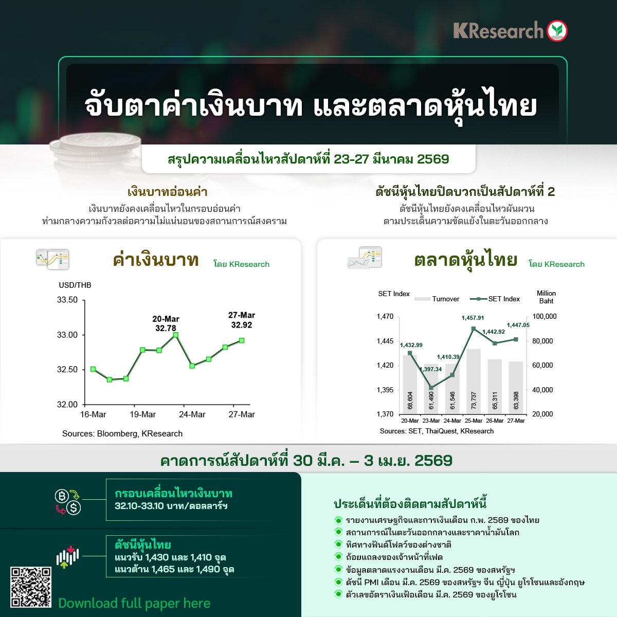 • สัปดาห์ระหว่างวันที่ 30 มี.ค. – 3 เม.ย. 2569 KBank คาดกรอบการเคลื่อนไหวของเงินบาทที่ 32.10-33.10 บาทต่อดอลลาร์ฯ ปัจจัยที่ต้องติดตาม ได้แก่ รายงานเศรษฐกิจและการเงินเดือนก.พ. ของไทย สถานการณ์ในตะวันออกกลาง ทิศทางราคาน้ำมันในตลาดโลก ฟันด์โฟลว์ของต่างชาติ สัญญาณเกี่ยวกับแนวโน้มดอกเบี้ยจากถ้อยแถลงของเจ้าหน้าที่เฟด ข้อมูลตลาดแรงงานเดือนมี.ค. ของสหรัฐฯ ดัชนี PMI เดือนมี.ค. ของสหรัฐฯ จีน ญี่ปุ่น ยูโรโซนและอังกฤษ รวมถึงตัวเลขอัตราเงินเฟ้อเดือนมี.ค. ของยูโรโซน