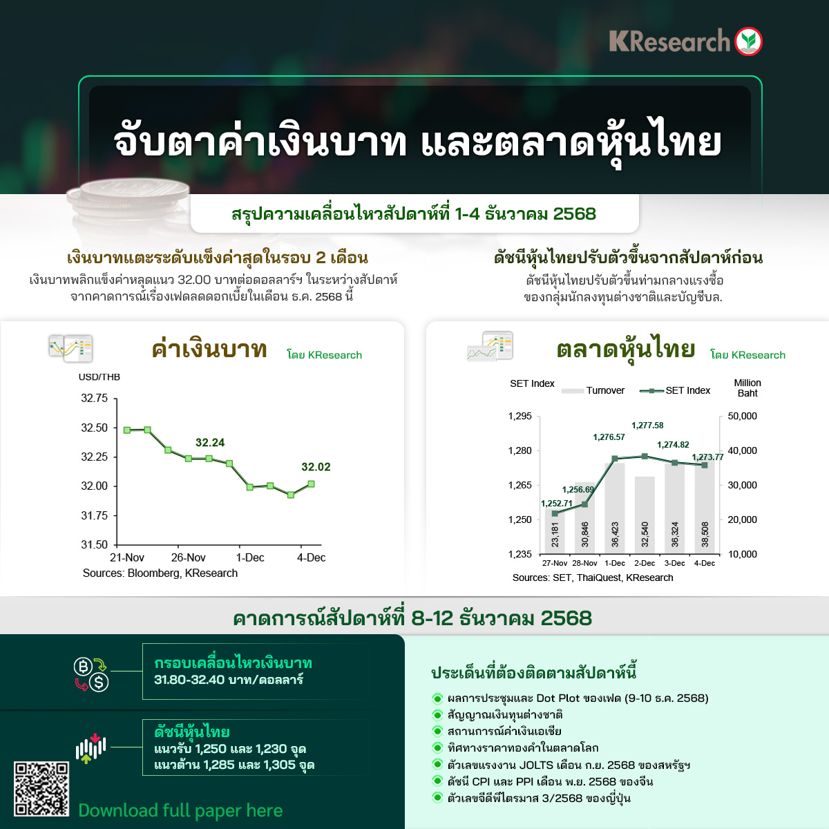 • สัปดาห์ระหว่างวันที่ 8-12 ธ.ค. 2568 KBank คาดกรอบการเคลื่อนไหวของเงินบาทที่ 31.80-32.40 บาทต่อดอลลาร์ฯ ปัจจัยที่ต้องติดตาม ได้แก่ ผลการประชุมและ Dot Plot ของเฟด ทิศทางฟันด์โฟลว์ของต่างชาติ สถานการณ์ค่าเงินเอเชียและราคาทองคำในตลาดโลก ตัวเลขเงินเฟ้อคาดการณ์ในมุมมองผู้บริโภคเดือนพ.ย. และตัวเลขการเปิดรับสมัครงานและอัตราการหมุนเวียนของแรงงานเดือนก.ย. ของสหรัฐฯ ตลอดจนข้อมูลเศรษฐกิจเดือนพ.ย. ของจีน อาทิ ตัวเลขการส่งออก ดัชนีราคาผู้บริโภคและดัชนีราคาผู้ผลิต