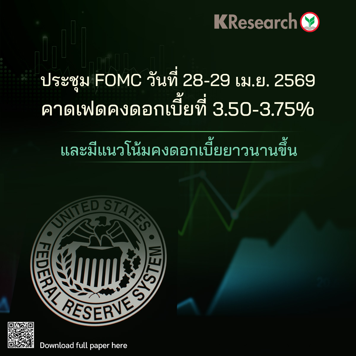 ในการประชุม FOMC วันที่ 28-29 เม.ย. 2569 คาดเฟดมีมติคงดอกเบี้ยนโยบายที่ 3.50-3.75% เพื่อรอประเมินแนวโน้มเศรษฐกิจและเงินเฟ้อ ท่ามกลางความไม่แน่นอนในตะวันออกกลางที่ยังอยู่ในระดับสูง
