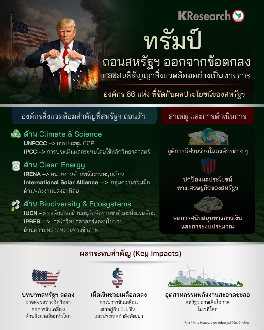 • ผลกระทบคือบทบาทสหรัฐฯ บนเวทีสิ่งแวดล้อมโลกลดลงอย่างมีนัยสำคัญ การกำหนดมาตรฐานด้าน climate และ biodiversity อาจถูกขับเคลื่อนโดยประเทศอื่น เช่น EU และจีน ส่งผลต่อทิศทางนโยบายโลก การลงทุน และธุรกิจสีเขียวในระยะยาว