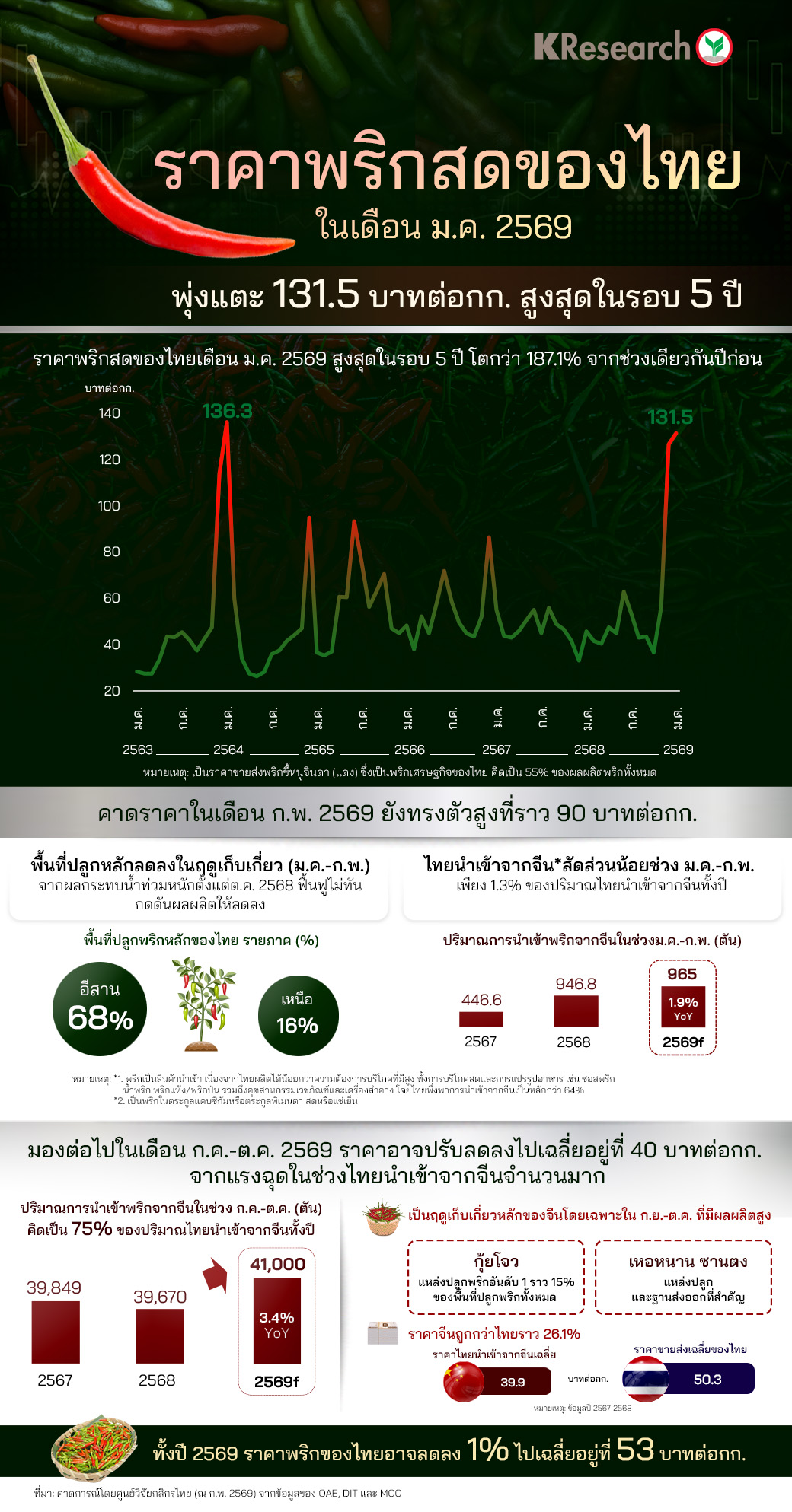 • ราคาพริกสดของไทยในเดือนม.ค. 2569 พุ่งแตะ 131.5 บาทต่อกก. สูงสุดในรอบ 5 ปี และคาดว่าราคาในเดือนก.พ. 2569 จะยังทรงตัวสูงที่ราว 90 บาทต่อกก. เนื่องจากพื้นที่ปลูกหลักในภาคอีสานและภาคเหนือลดลงในฤดูเก็บเกี่ยว (ม.ค.-ก.พ.) จากผลกระทบน้ำท่วมหนักตั้งแต่ต.ค. 2568 ฟื้นฟูไม่ทัน กดดันผลผลิตให้ลดลง ประกอบกับเป็นช่วงที่ไทยนำเข้าจากจีนในสัดส่วนน้อย