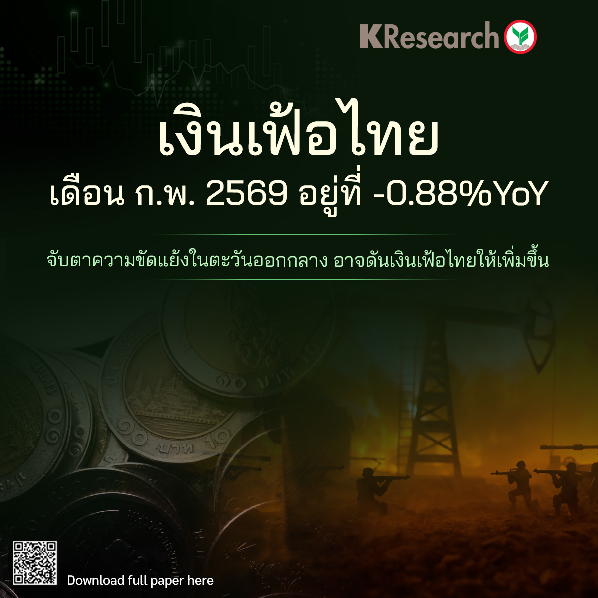 o ในปี 2569 ศูนย์วิจัยกสิกรไทยยังคงประมาณการเงินเฟ้อไทยอยู่ที่ 0.4% อย่างไรก็ดีมีความเป็นไปได้ที่เงินเฟ้อจะปรับสูงขึ้นจากสถานการณ์ความขัดแย้งในภูมิภาคตะวันออกกลาง โดยยังขึ้นอยู่กับความยืดเยื้อและระดับความรุนแรงของสถานการณ์ รวมถึงมาตรการพยุงราคาสินค้าในประเทศของรัฐบาล โดยมีรายละเอียดดังต่อไปนี้