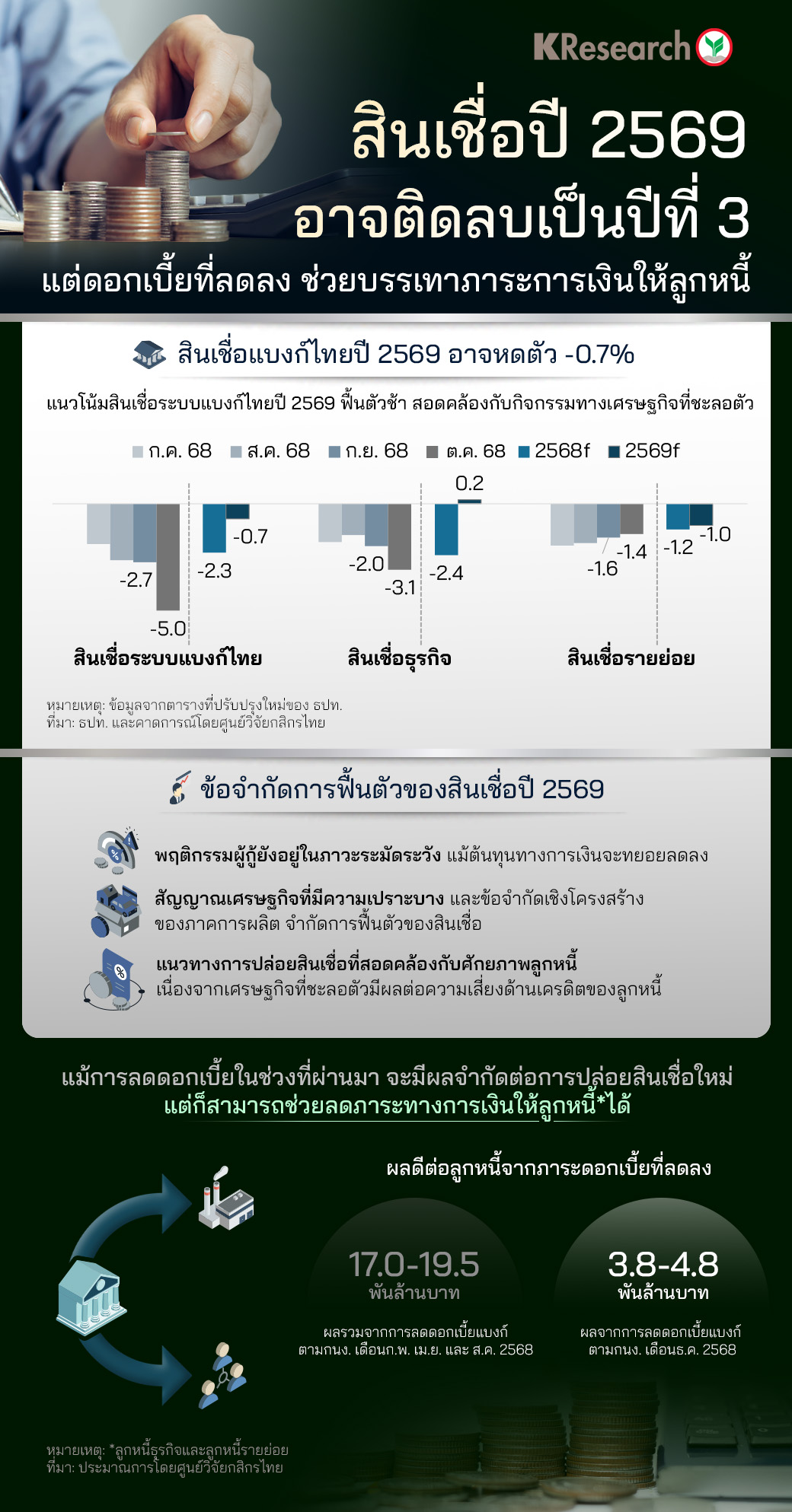 • เศรษฐกิจปี 2569 ที่มีความเปราะบางยังมีผลต่อการฟื้นตัวของสินเชื่อ ซึ่งทำให้ศูนย์วิจัยกสิกรไทย คาดว่า สินเชื่อระบบแบงก์ไทยอาจหดตัวลง -0.7% ในปี 2569 เพราะแม้สินเชื่อธุรกิจรายใหญ่อาจกลับมาขยายตัวได้ แต่การฟื้นตัวของสินเชื่อ SMEs และสินเชื่อรายย่อยยังคงเผชิญข้อจำกัดหลายด้าน โดยเฉพาะปัญหาความสามารถในการแข่งขันของภาคธุรกิจ รวมถึงรายได้และกำลังซื้อของครัวเรือนในประเทศ