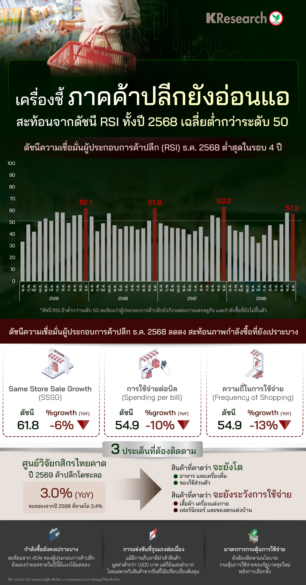 • ดัชนีความเชื่อมั่นผู้ประกอบการค้าปลีก (RSI) เดือน ธ.ค. 2568 อยู่ที่ 57.2 ต่ำสุดในรอบ 4 ปี ขณะที่ทั้งปี 2568 ดัชนี RSI เฉลี่ยยังต่ำกว่าระดับ 50 สะท้อนว่า ผู้ประกอบการค้าปลีกยังกังวลต่อภาวะเศรษฐกิจ และกำลังซื้อที่ยังไม่ฟื้นตัว