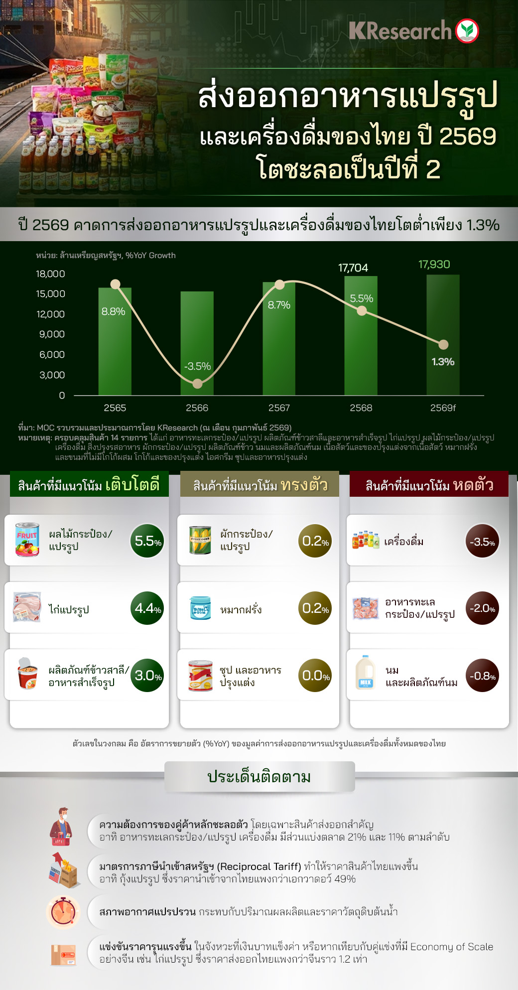 • ส่งออกอาหารแปรรูปและเครื่องดื่มของไทย ปี 2569 คาดโตชะลอเป็นปีที่ 2 หรือมีมูลค่าส่งออกราว 1.79 หมื่นล้านเหรียญสหรัฐฯ โตต่ำเพียง 1.3% เมื่อเทียบกับปีก่อน