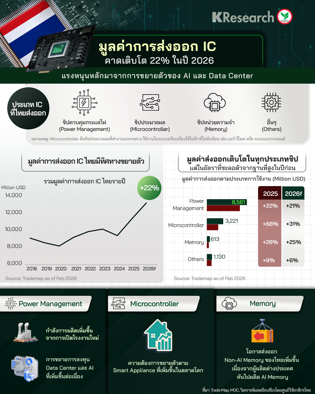 - มูลค่าการส่งออก IC ไทยปี 2026 คาดโต 22% จากแรงหนุนการลงทุนด้าน AI และ Data Center ทั่วโลก แม้ไทยไม่ได้ผลิตชิป AI ขั้นสูงโดยตรง แต่ความต้องการชิปทั่วไปในห่วงโซ่อุปทานที่เพิ่มขึ้นยังสนับสนุนให้การส่งออกเติบโตต่อเนื่อง