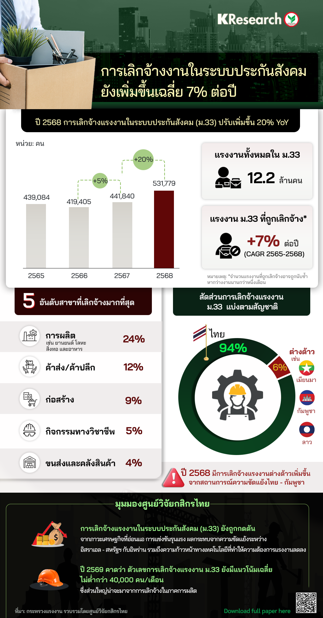 • การเลิกจ้างแรงงานในระบบประกันสังคม (ม.33) มีแนวโน้มเพิ่มขึ้นเฉลี่ยปีละ 7% (CAGR 2565-2568) โดยสิ้นปี 2568 มีแรงงานถูกเลิกจ้าง 531,779 คน เพิ่มขึ้น 20% (YoY)