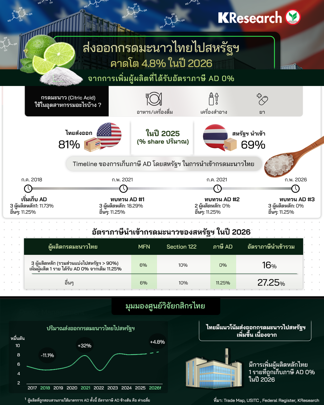 • ส่งออกกรดมะนาวไทยไปสหรัฐฯ คาดว่าจะโต 4.8% ในปี 2026 เนื่องจากมีการเพิ่มผู้ผลิตหลักไทยอีก 1 รายที่ถูกเก็บภาษี AD 0%