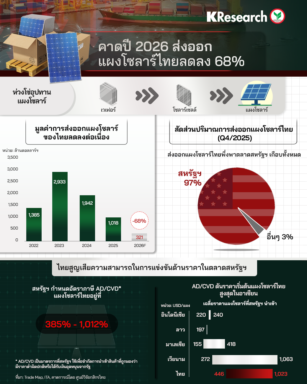 • คาดว่าปี 2026 การส่งออกแผงโซลาร์ของไทยจะหดตัวถึง -68% จากปีก่อนหน้า สะท้อนผลกระทบจากมาตรการภาษีของสหรัฐฯ โดยเฉพาะ AD/CVD ที่กดดันต้นทุนและความสามารถในการแข่งขันของผู้ประกอบการไทยอย่างมีนัยสำคัญ