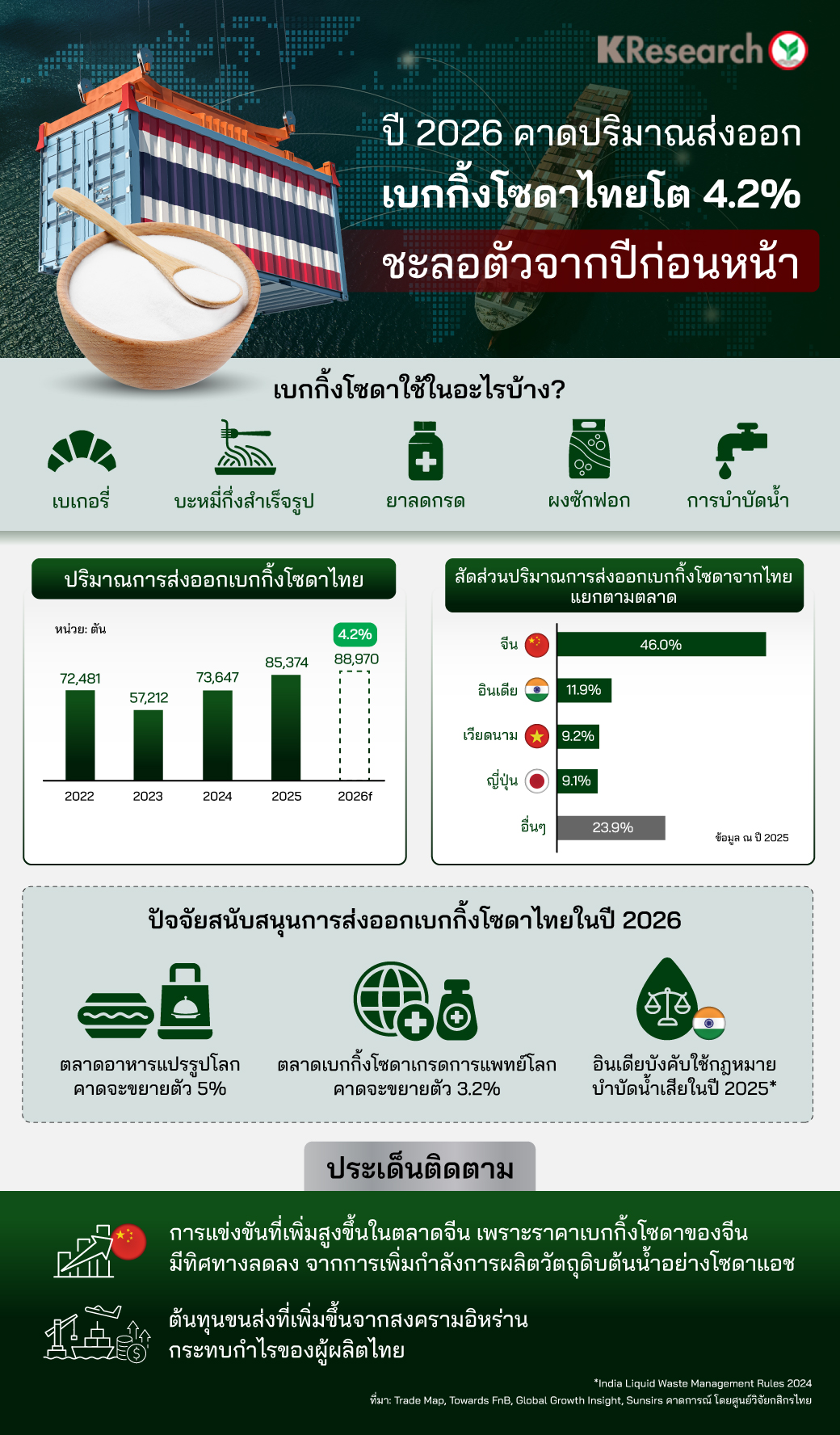 • การส่งออกเบกกิ้งโซดาไทยยังคงเติบโตต่อเนื่อง แม้มีแนวโน้มชะลอลง โดยในปี 2026 คาดว่าปริมาณส่งออกจะขยายตัว 4.2% สอดคล้องกับการเติบโตของอุตสาหกรรมปลายน้ำ เช่น ตลาดอาหารแปรรูปโลกที่คาดว่าจะเติบโต 5% และตลาดเบกกิ้งโซดาเกรดการแพทย์โลกที่คาดจะขยายตัว 3.2% รวมถึงกฎหมายด้านบำบัดน้ำเสียของประเทศคู่ค้าหลักของไทยอย่าง อินเดีย ที่มีการบังคับใช้กฎหมาย India Liquid Waste Management Rules ในปลายปี 2025