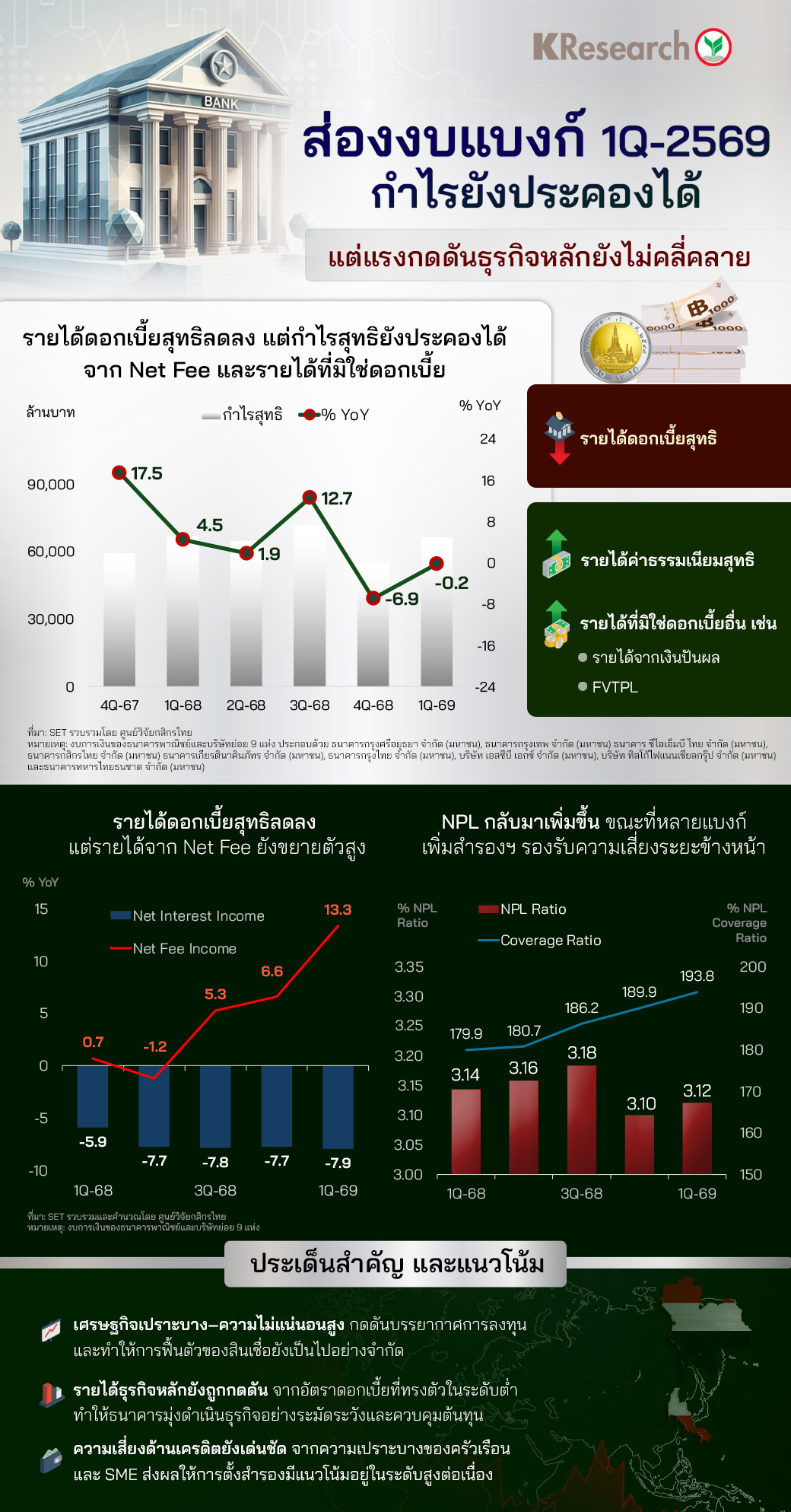 ส่องงบแบงก์ 1Q-2569 กำไรยังประคองได้ แต่แรงกดดันธุรกิจหลักยังไม่คลี่คลาย