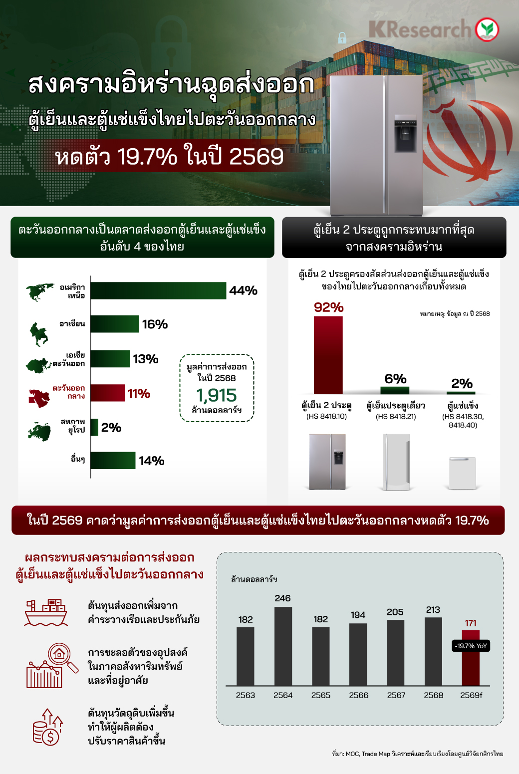 3.    ผลกระทบจากสงครามส่งผลให้ต้นทุนการส่งออกเพิ่มสูงขึ้น จากการปรับตัวเพิ่มขึ้นของค่าระวางเรือ ค่าเบี้ยประกันภัย และต้นทุนวัตถุดิบ ขณะเดียวกัน อุปสงค์ในภาคอสังหาริมทรัพย์และที่อยู่อาศัยชะลอตัว ทั้งนี้ ในปี 2569 คาดว่า มูลค่าการส่งออกตู้เย็นและตู้แช่แข็งของไทยไปยังตะวันออกกลางจะหดตัวลง 19.7%