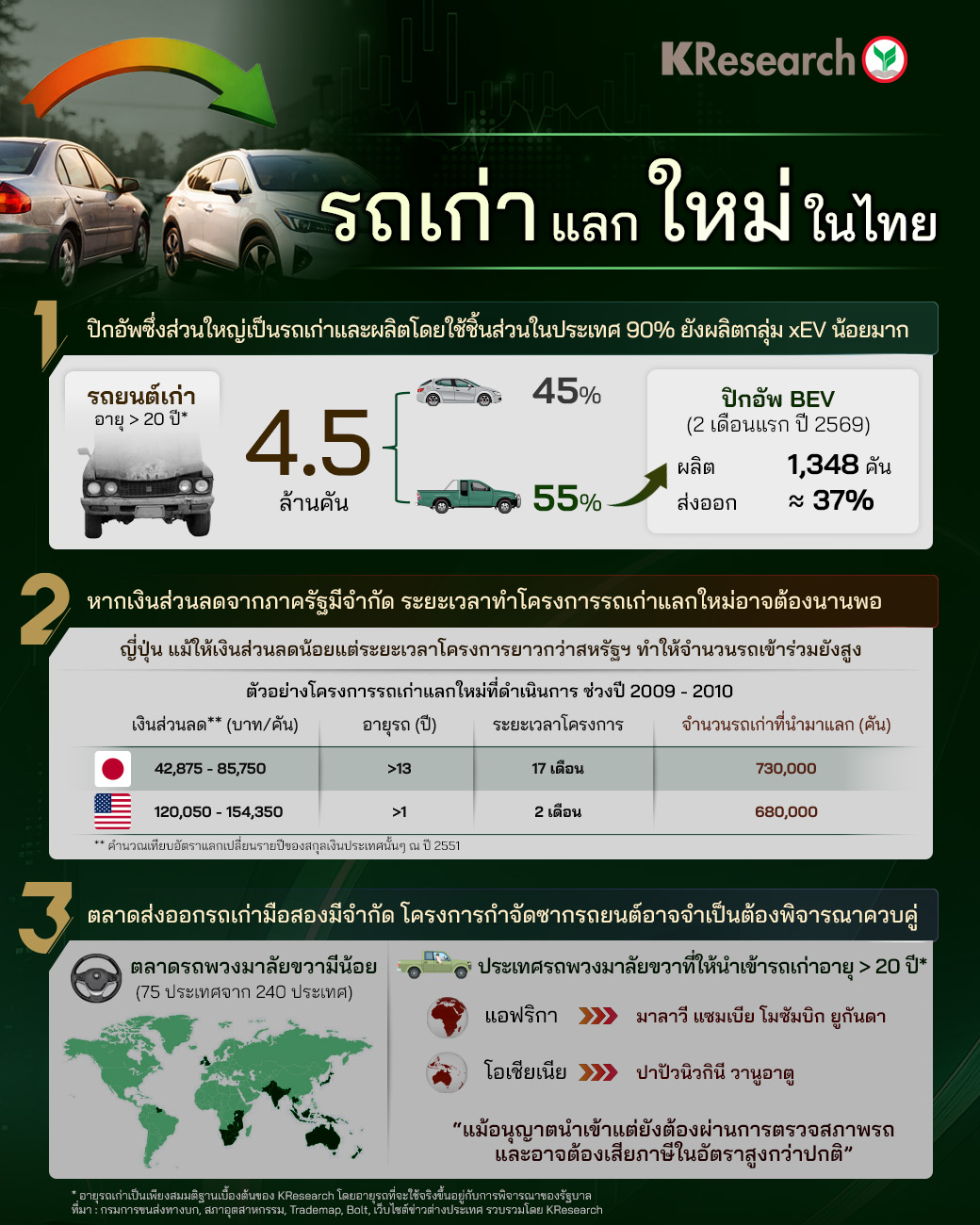 • รัฐบาลมีแนวคิดพิจารณาทำโครงการรถเก่าแลกใหม่ เพื่อแก้ปัญหาการผลิตรถยนต์ในประเทศที่ชะลอตัวและลดปัญหามลพิษทางอากาศจากควันเสีย ศูนย์วิจัยกสิกรไทยมองว่า แม้โครงการยังไม่ได้ข้อสรุปชัดเจน แต่อาจบางประเด็นที่ภาครัฐควรพิจารณาเพื่อเป็นแนวทางในการส่งเสริมการผลิตรถยนต์ในประเทศได้