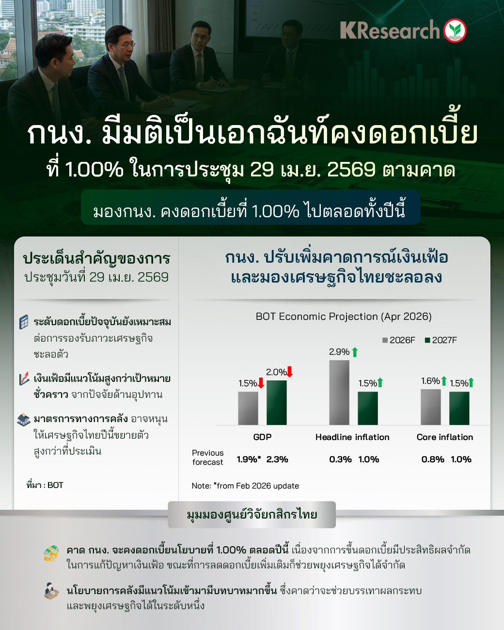 กนง. มีมติเป็นเอกฉันท์คงดอกเบี้ย ที่ 1.00% ในการประชุม 29 เม.ย. ตามคาด