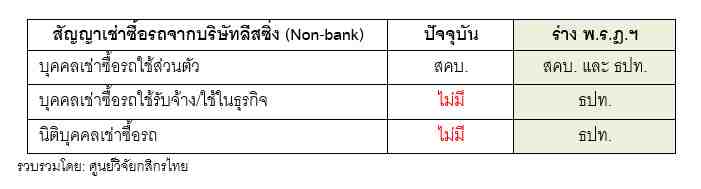 ศูนย์วิจัยกสิกรไทย สรุปสาระสำคัญของร่างกฎหมายนี้ที่มีต่อผู้เช่าซื้อรถจากบริษัทลีสซิ่งที่ไม่ใช่สถาบันการเงิน ดังนี้