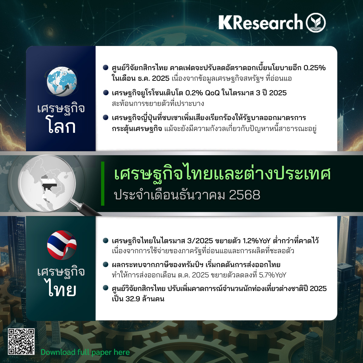• ศูนย์วิจัยกสิกรไทย คาดเฟดจะปรับลดอัตราดอกเบี้ยนโยบายอีก 0.25% ในเดือนธ.ค. 2025 เนื่องจากข้อมูลเศรษฐกิจสหรัฐฯ ที่อ่อนแอ