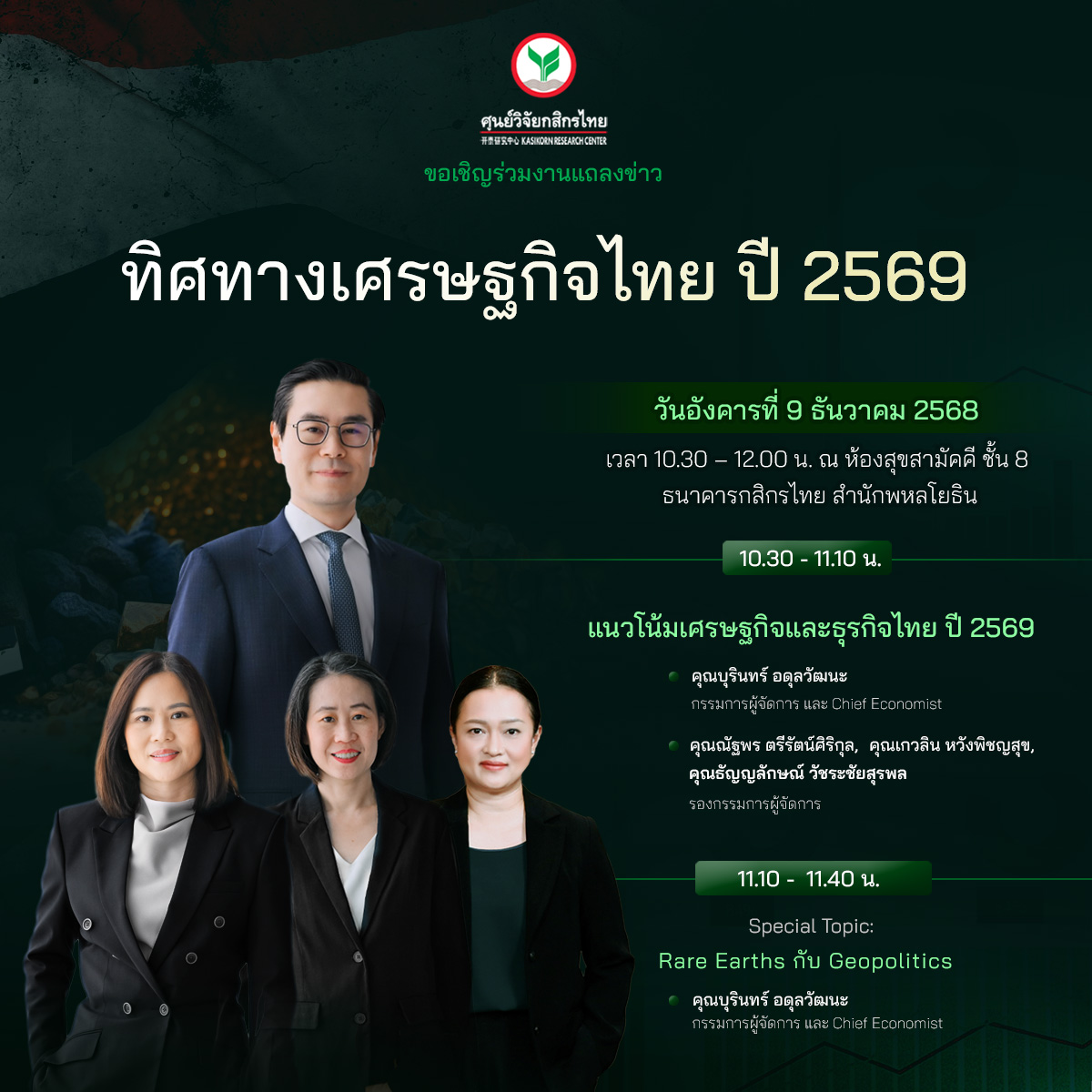นางสาวณัฐพร ตรีรัตน์ศิริกุล รองกรรมการผู้จัดการ บริษัท ศูนย์วิจัยกสิกรไทย จำกัด ระบุว่า เศรษฐกิจไทยมีแนวโน้มชะลอลงในปี 2569 โดยศูนย์วิจัยกสิกรไทยคาดการณ์อัตราการเติบโตของเศรษฐกิจไทยปี 2569 ที่ 1.6% เทียบกับปี 2568 ที่คาดว่าจะขยายตัวที่ 2.0% โดยส่งออกสินค้าของไทยในปี 2569 คาดว่าจะหดตัวส่งผลทำให้แรงขับเคลื่อนที่สำคัญของเศรษฐกิจไทยลดลง การท่องเที่ยวที่จะยังฟื้นตัวกลับมาได้ไม่เต็มที่ ในขณะที่การบริโภคของครัวเรือนที่ยังเป็นแรงขับเคลื่อนหลักของเศรษฐกิจมีแนวโน้มชะลอลง ส่วนหนึ่งจากแรงหนุนจากการใช้จ่ายและมาตรการกระตุ้นเศรษฐกิจของภาครัฐอาจลดลงตามข้อจำกัดทางการคลัง โดยคาด กนง. ลดดอกเบี้ยนโยบายต่ออีก 1 ครั้ง ในปี 2569 นอกจากนี้ ยังต้องติดตามความไม่แน่นอนทางการเมือง โดยเฉพาะหลังการเลือกตั้งด้วยเช่นกัน