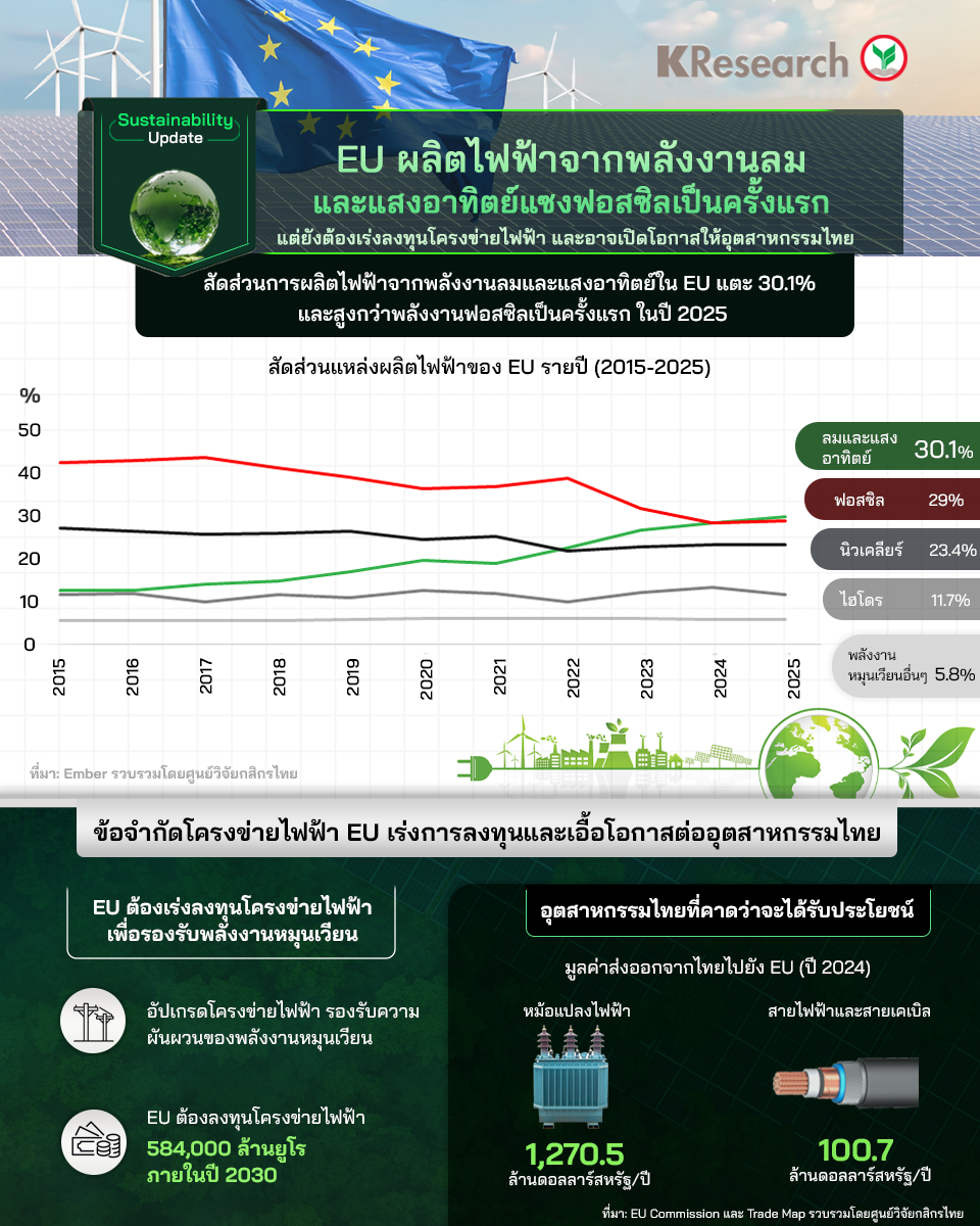 EU ผลิตไฟฟ้าจากพลังงานลมและแสงอาทิตย์แซงฟอสซิลเป็นครั้งแรก แต่ยังต้องเร่งลงทุนโครงข่ายไฟฟ้า และอาจเปิดโอกาสให้อุตสาหกรรมไทย
